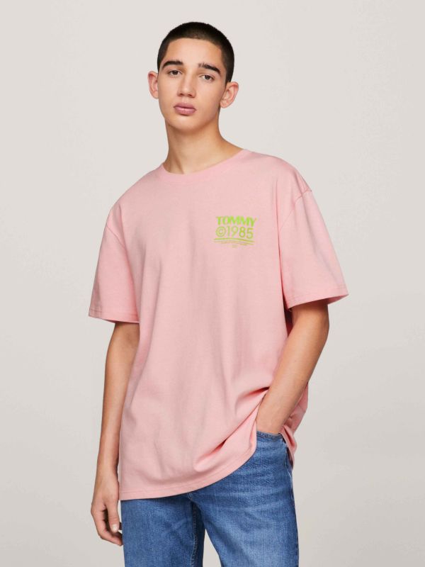 أكمل إطلالتك اليومية مع هذا التيشيرت المصنوع من القطن النقي والمزين بشعار تومي جينز من مجموعة 1985 على الصدر والظهر.