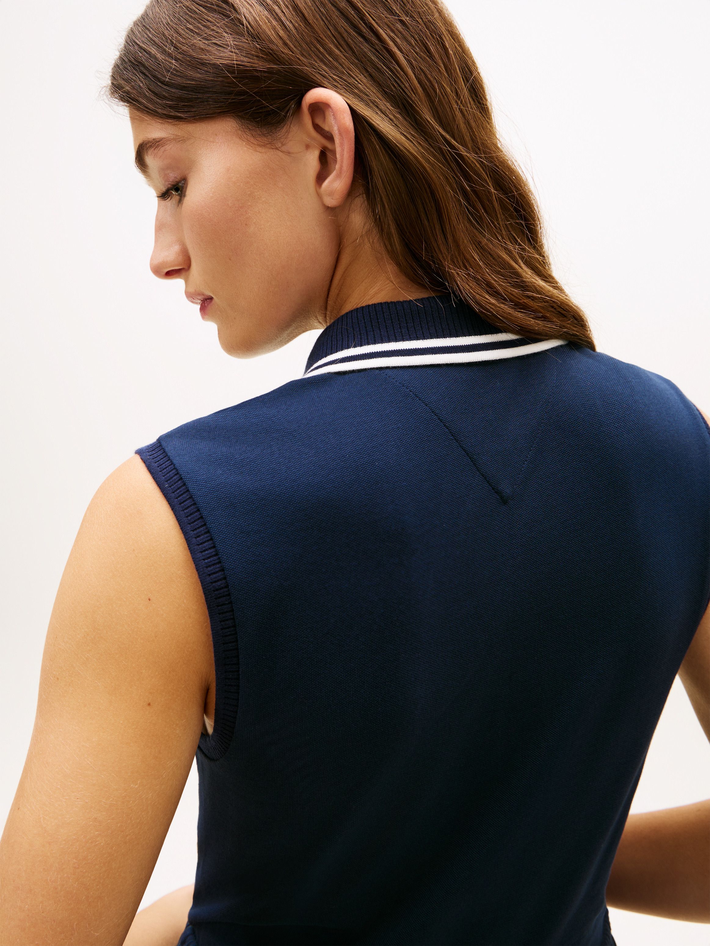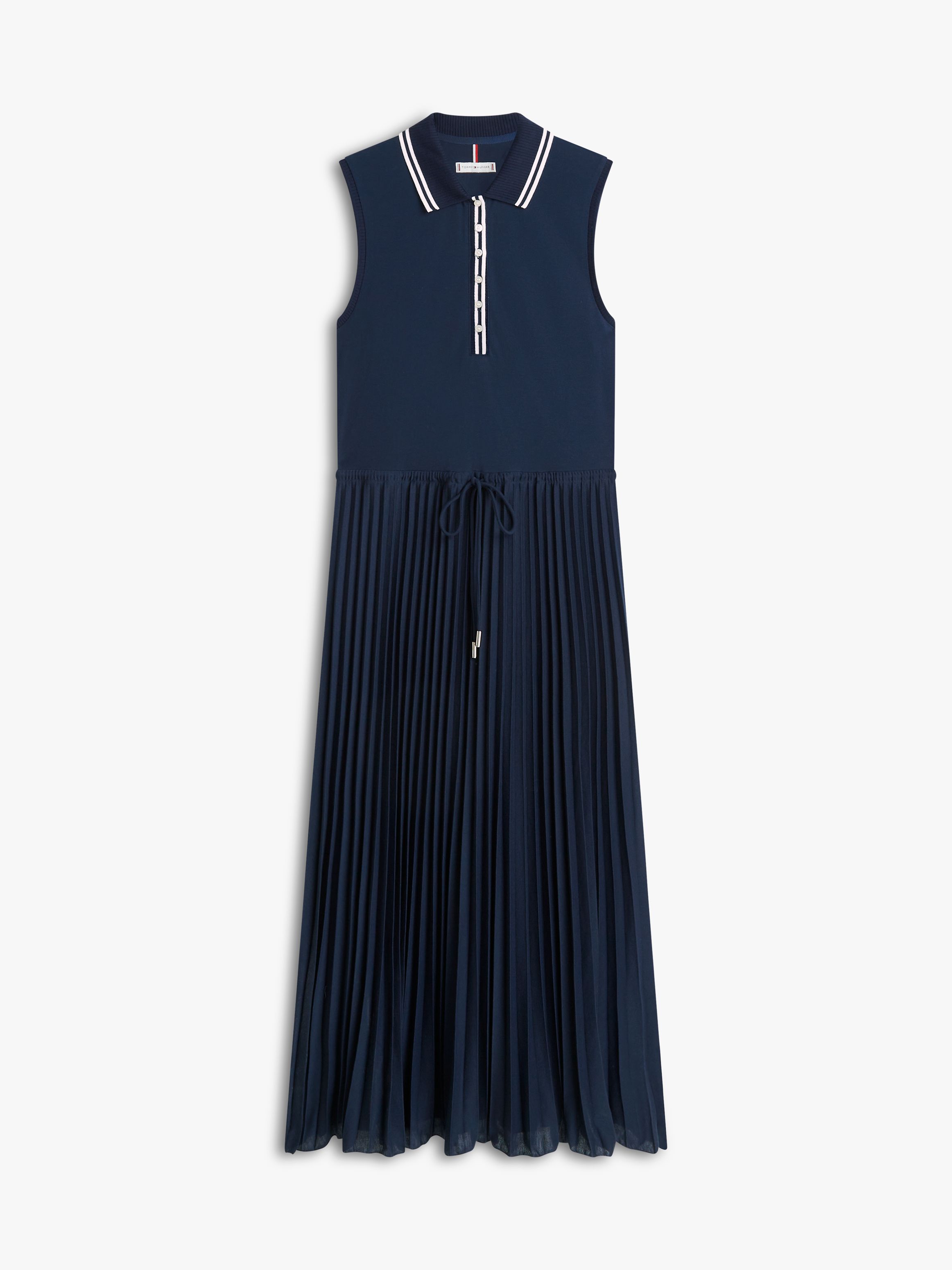 يتميز هذا الفستان الميدي بياقة بولو وحواف ملوّنة ونسيج بيكيه مستوحى من التصاميم الكلاسيكية، مع تنورة بثنيات تضيف لمسة أنثوية راقية.
