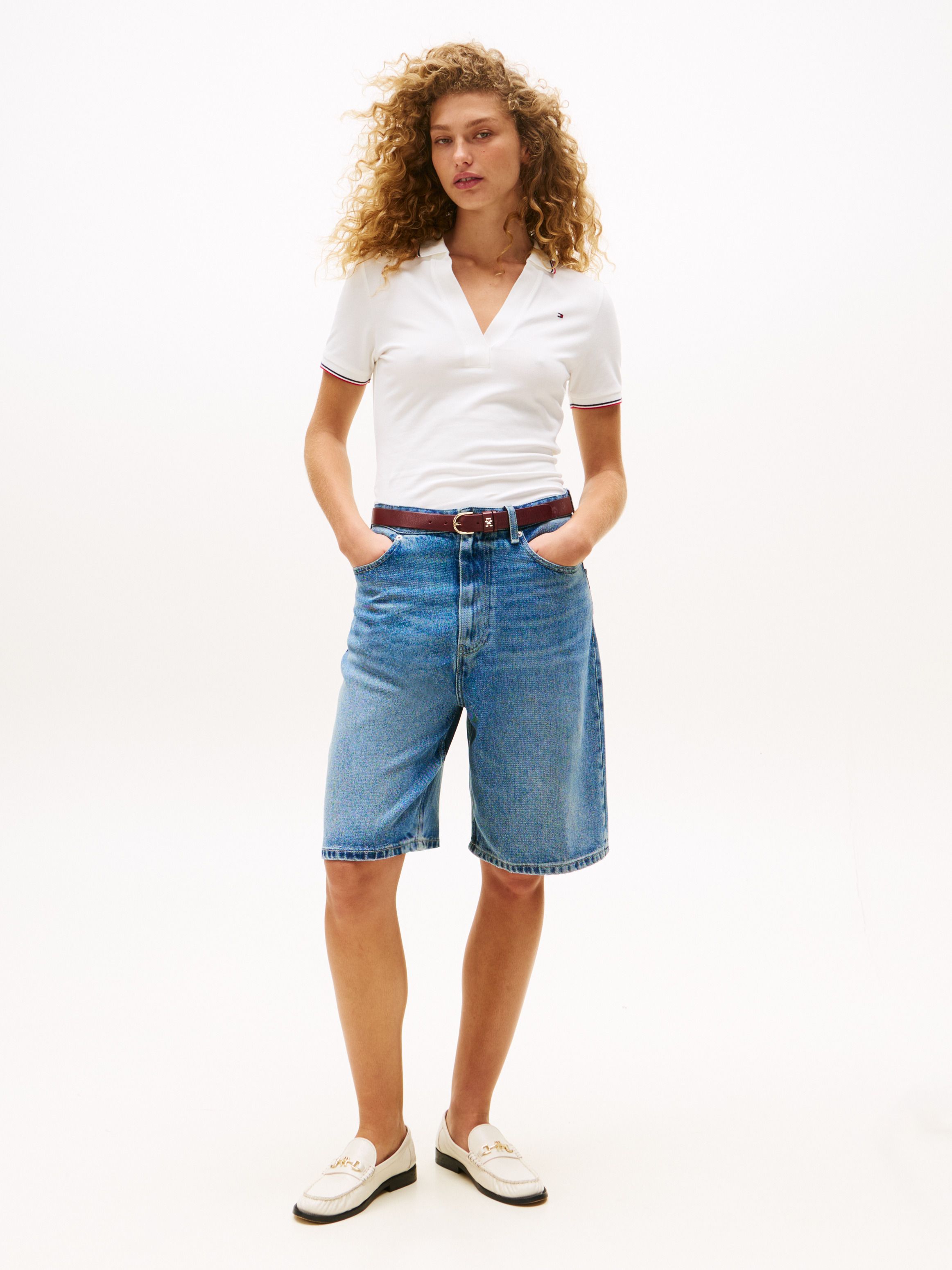 التفاصيل يأتي هذا القميص الرياضي بياقة بولو من مجموعة 1985، مستوحى من العام الذي أطلق فيه Tommy Hilfiger علامته التجارية، ويتميز بياقة V عميقة وتفاصيل بألوان الشعار. أبرز التفاصيل - قطن مطاطي - من مجموعة 1985 - ياقة وأساور بولو بحواف مميزة بألوان الشعار - فتحة ياقة مفتوحة - شعار Tommy Hilfiger - تطريز علم Tommy Hilfiger على الصدر القصة والمقاس - قصة ضيقة - ترتدي العارضة مقاس S ويبلغ طولها 1.76 م الخامة والعناية - 96% قطن، 4% إيلاستين