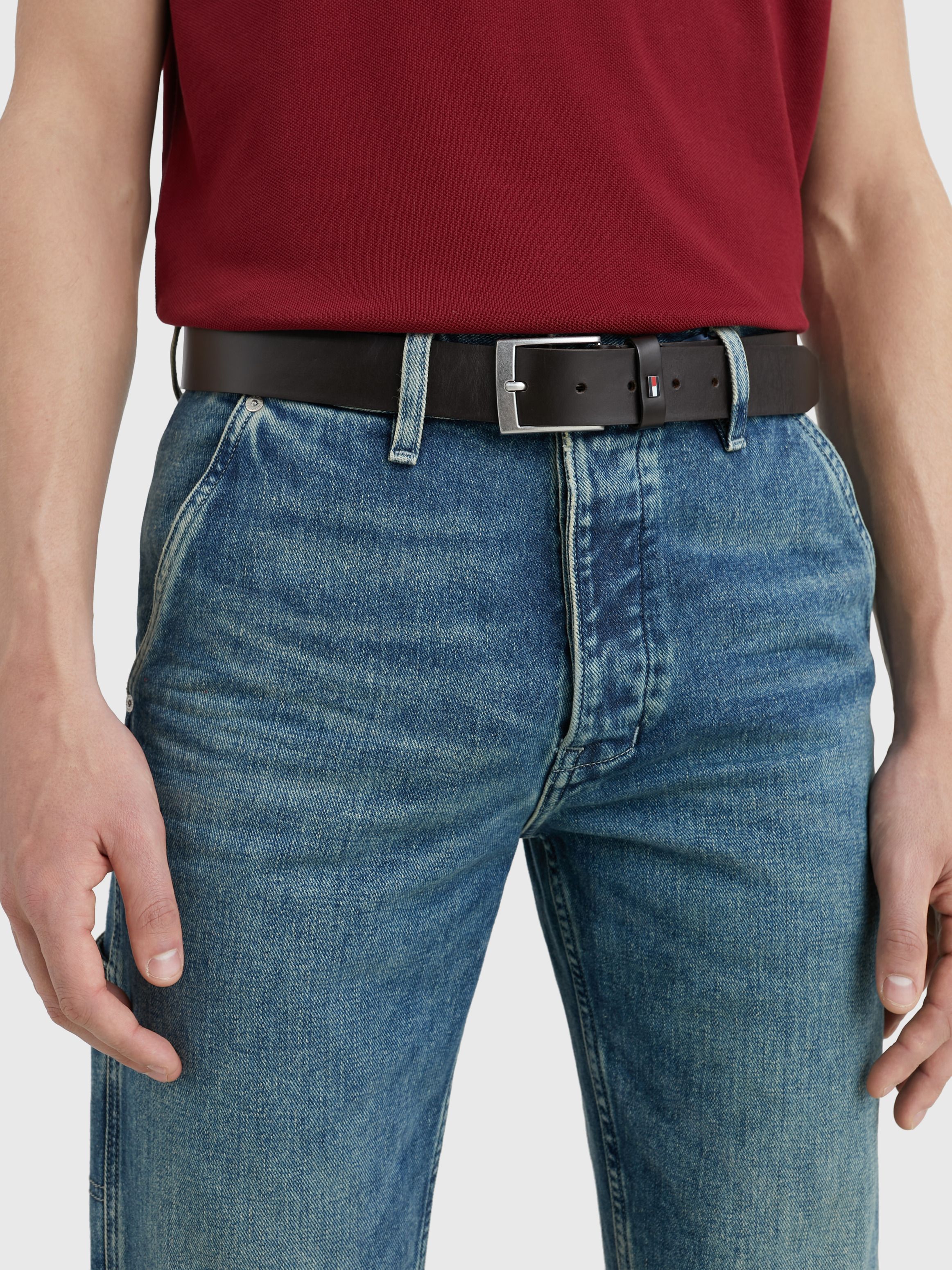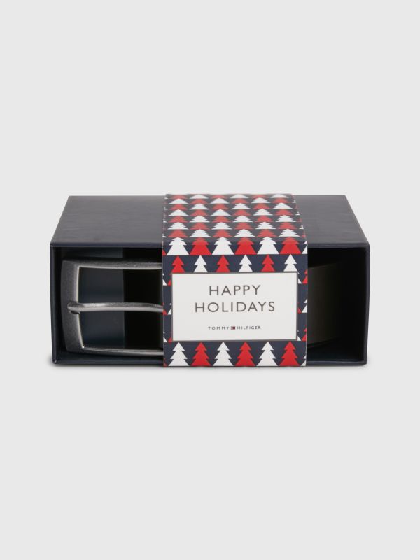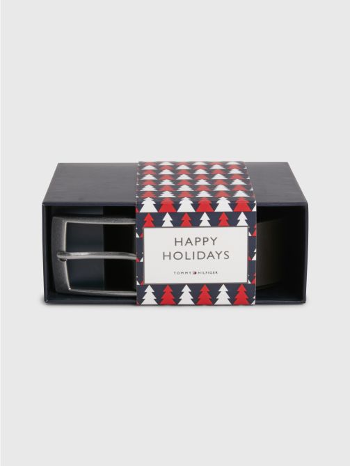 • جلد مدبوغ • صُنع من مجموعة أعمال الجلد • مُقدم في علبة هدايا • ملمس ناعم • إبزيم معدني مربع • علامة تومي هيلفيغر التجارية • علم تومي هيلفيغر على الحافظة