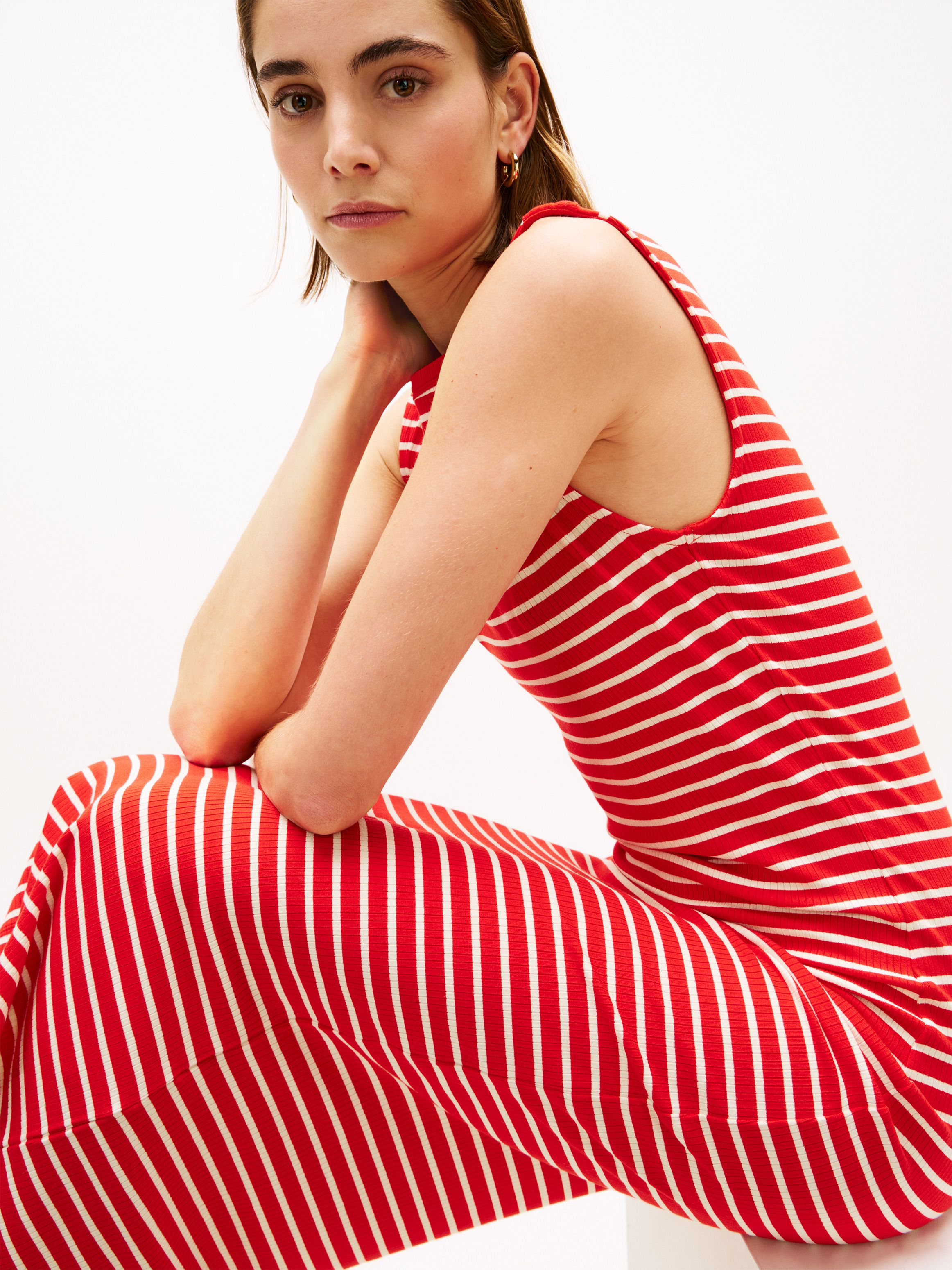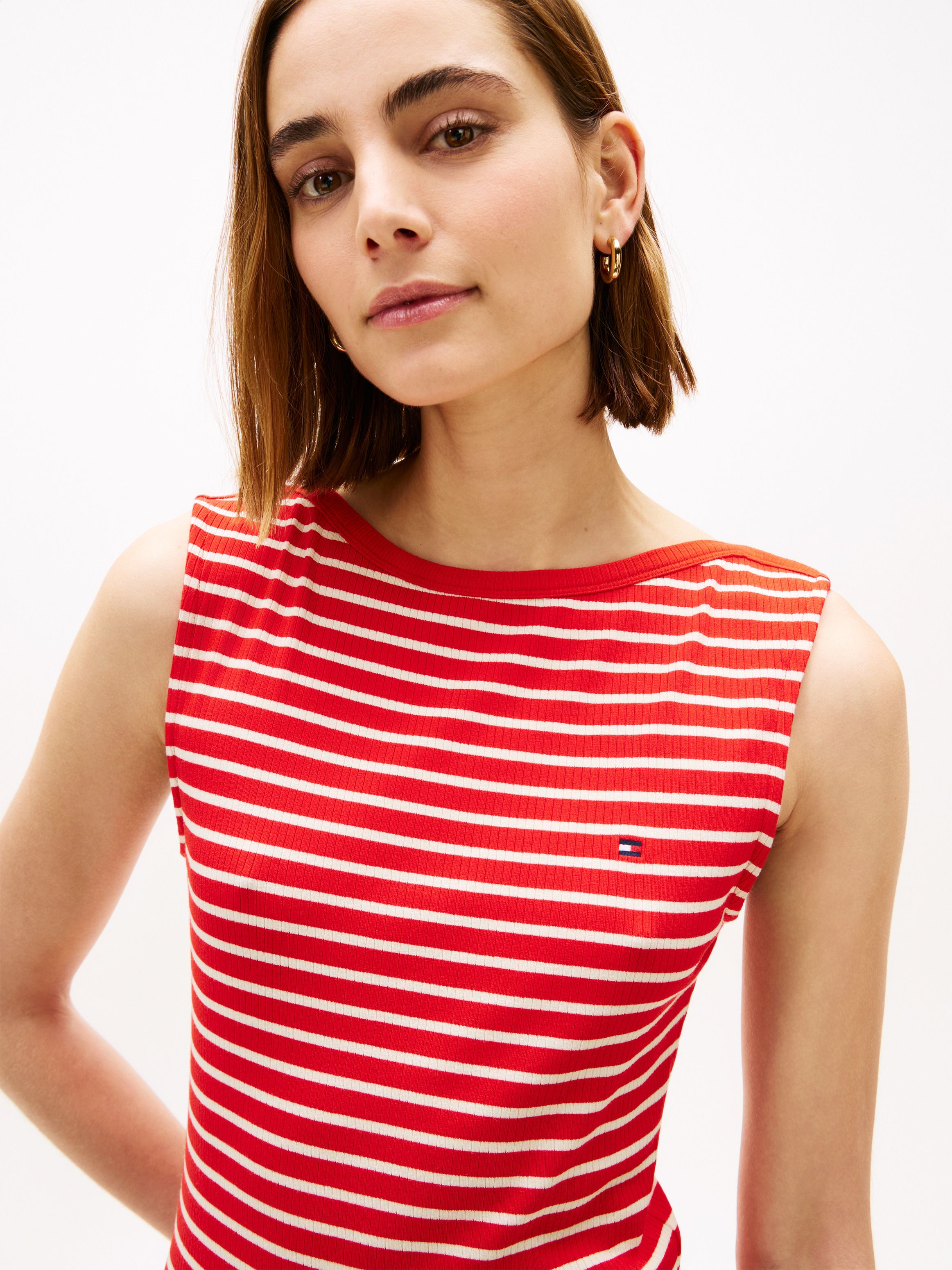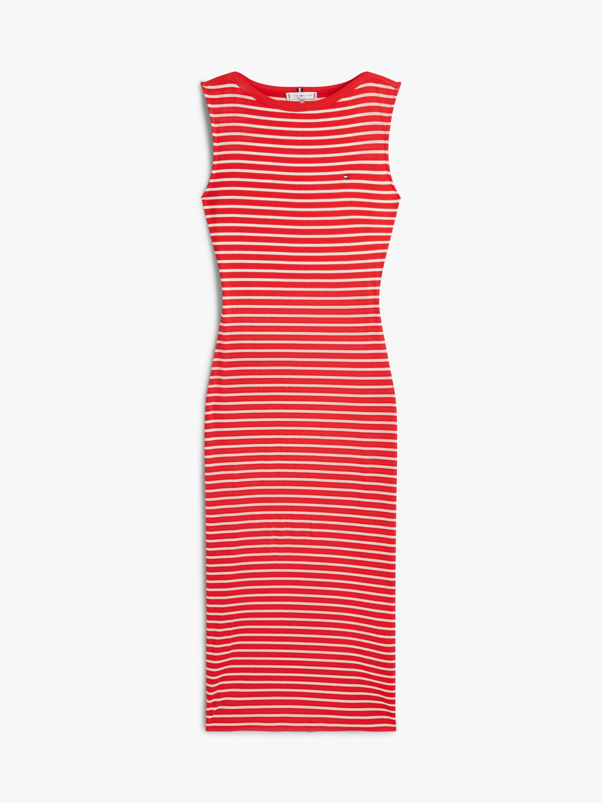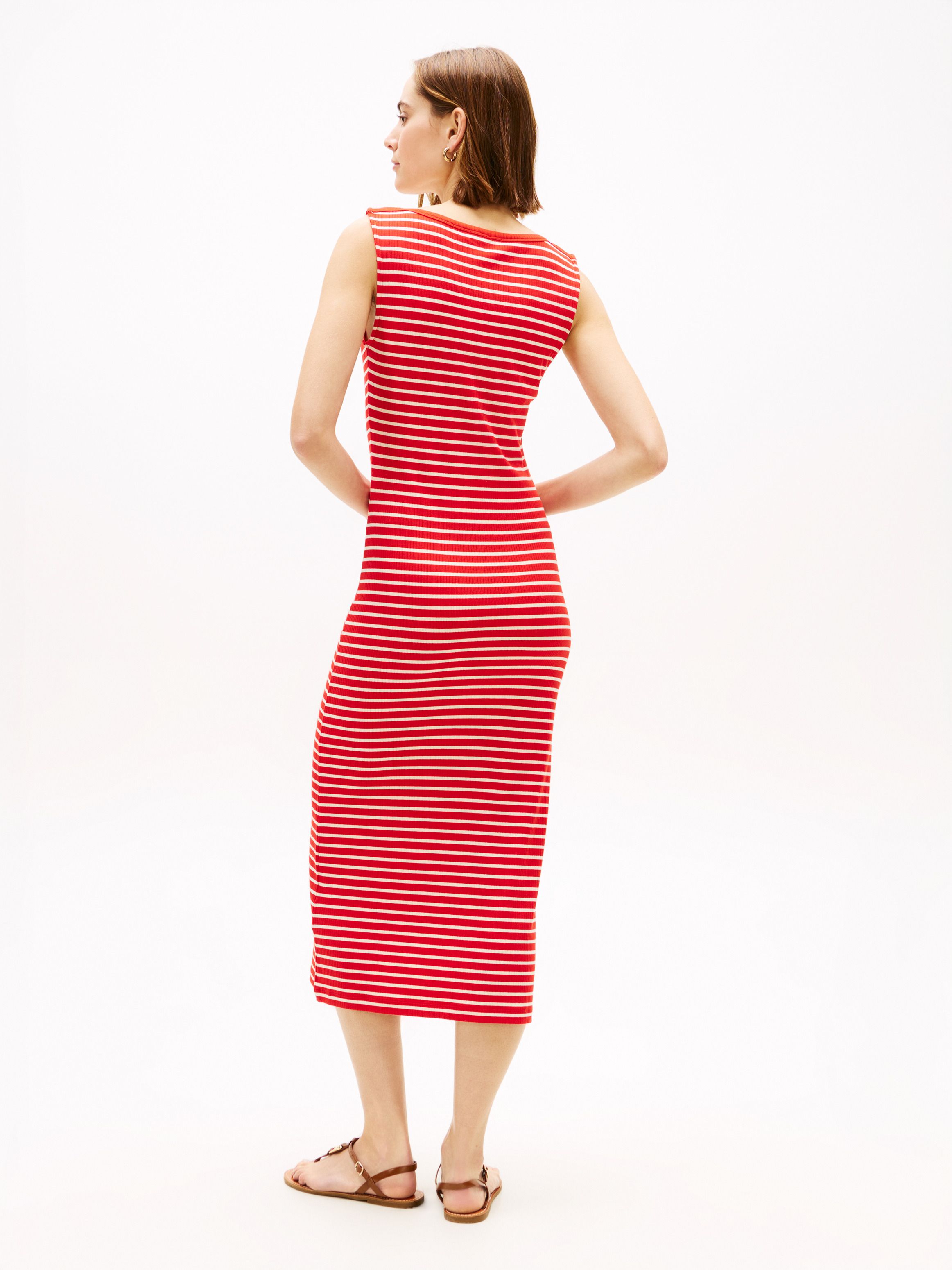 يتميز هذا الفستان الميدي المضلع بقصة Bodycon ضيقة وتطريزات أنيقة، مع ياقة قارب وتصميم بدون أكمام لإطلالة يومية جذابة.