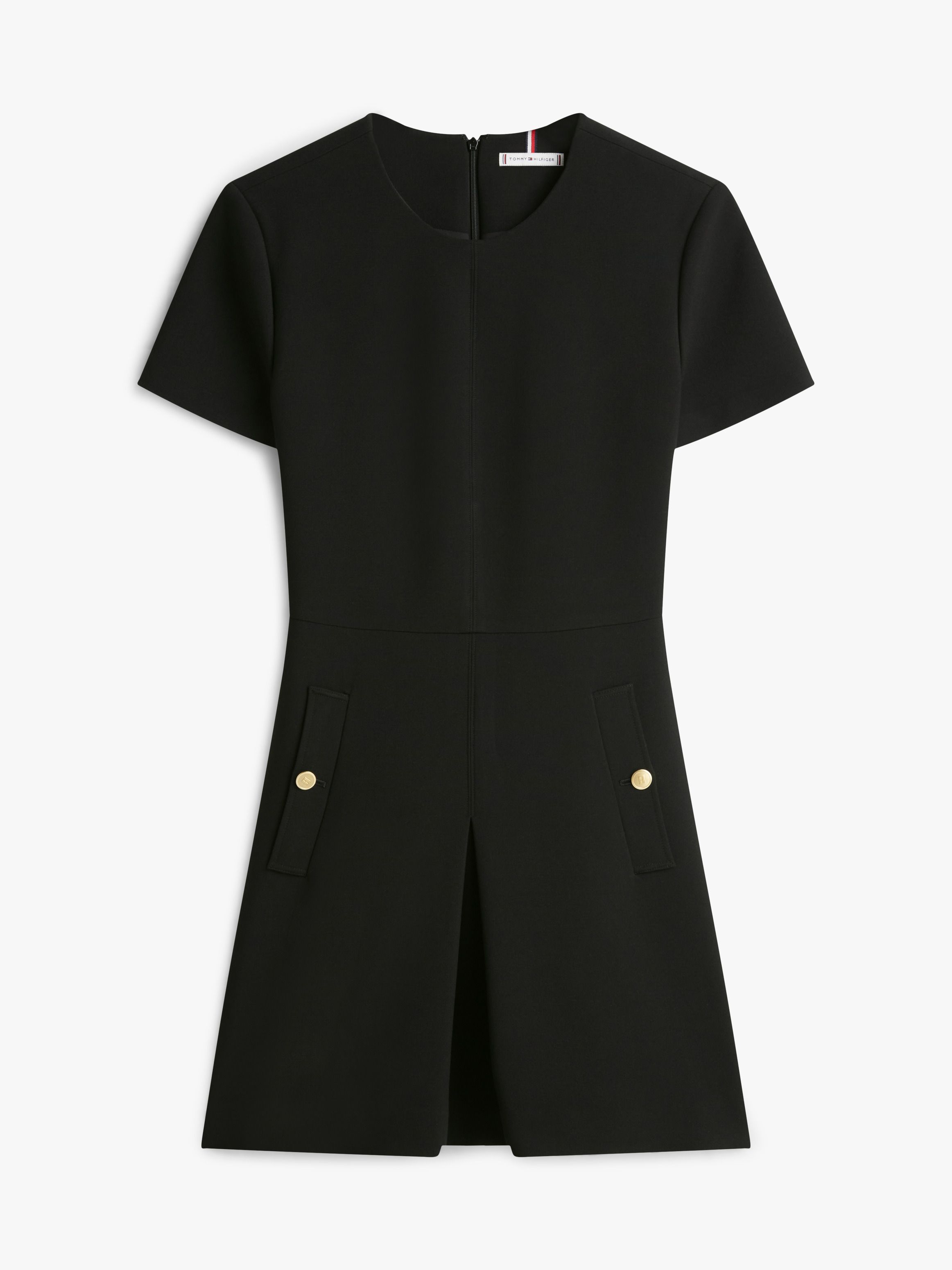 فستان قصير بجيوب مغلقة بأزرار بتصميم أنيق، يتميز بألواح محاكة ودرزات بارزة مع ثنية صندوقية أمامية تمنحه قصّة Fit & Flare جذابة رغم طوله الميني. أبرز التفاصيل • مزيج فيسكوز مطاطي • ياقة دائرية • جيبان أماميان مغلقان بأزرار ذهبية • كسرات صندوقية في الأمام • نقش علم Tommy Hilfiger على الأزرار • علامة Tommy Hilfiger • شارة Tommy Hilfiger المعدنية على الحافة السفلية القصة والمقاس • قصّة عادية • أكمام قصيرة • طول ميني • تصميم Shift Dress • العارضة بطول 1.76 م وترتدي مقاس 8 • الطول: 84 سم من الكتف للحافة (حسب مقاس 8) الخامة والعناية • 68% بوليستر، 28% فسكوز، 4% إيلاستين