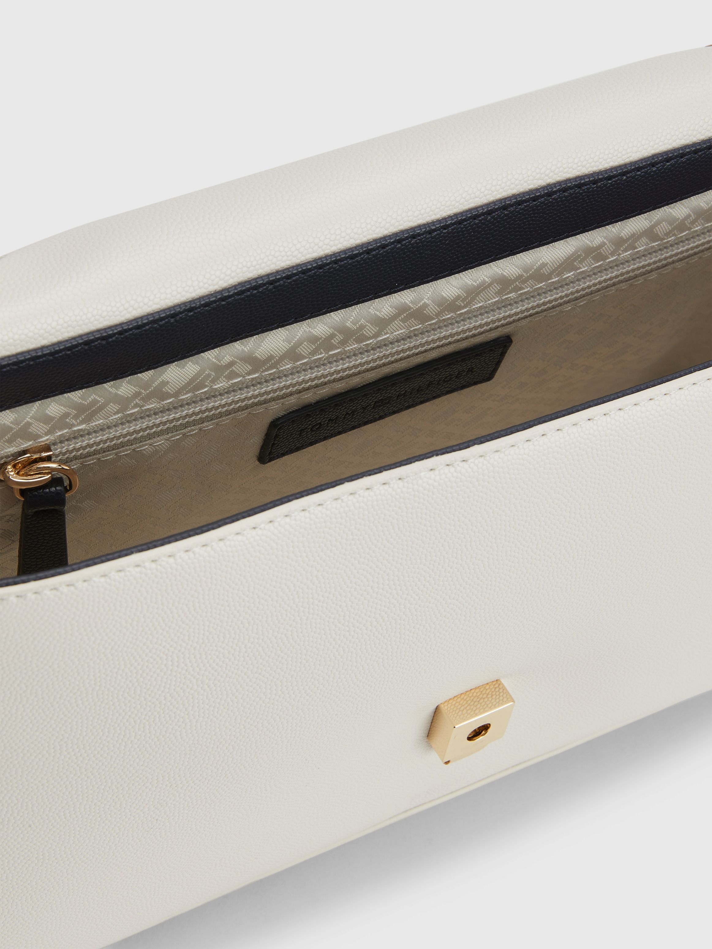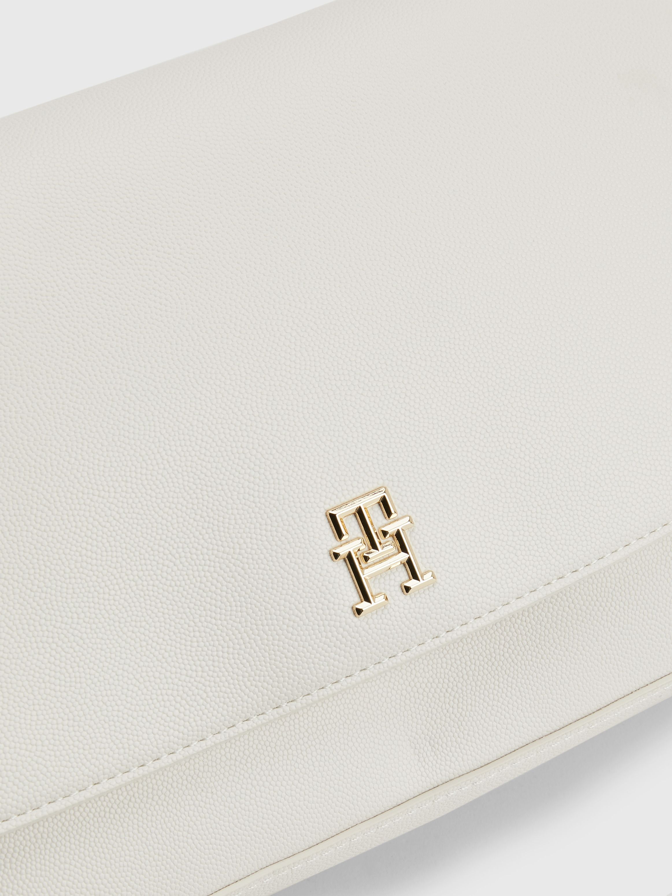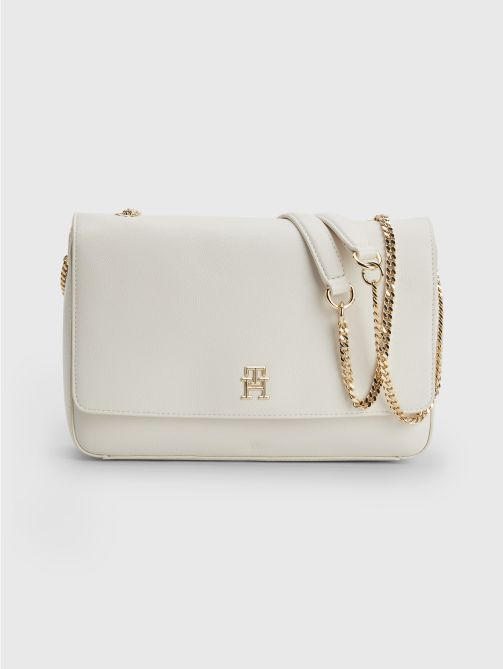 • ملمس ناعم • تُغلق بغطاء • مقبض علوي • حزام كروس سلسلة • جزء رئيسي واحد • جيب داخلي بسحاب • لوحة حروف الشعار على المقدمة • علامة تومي هيلفيغر التجارية