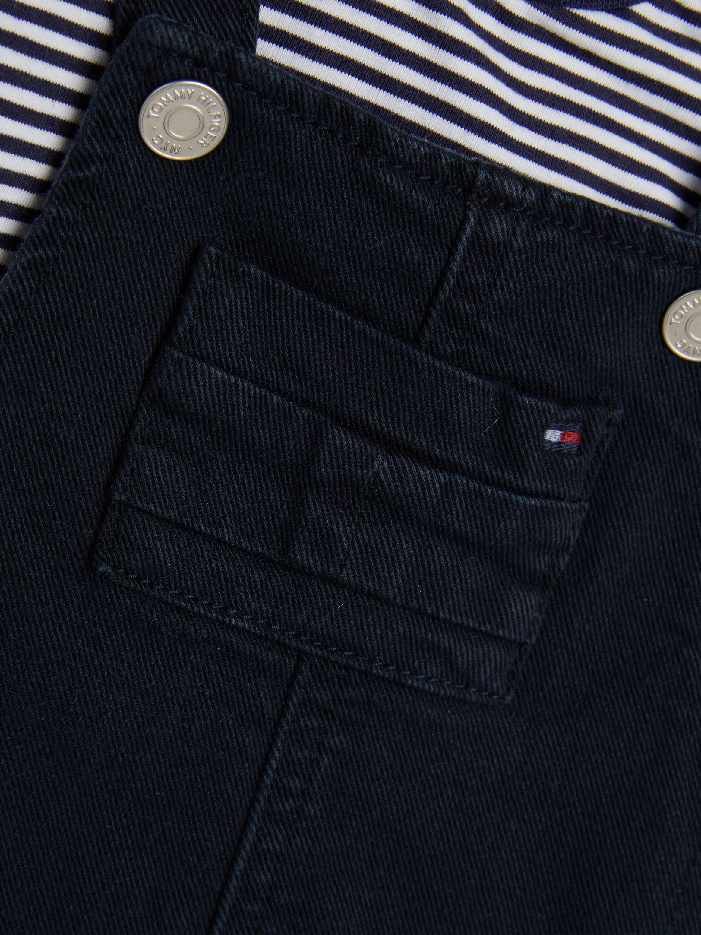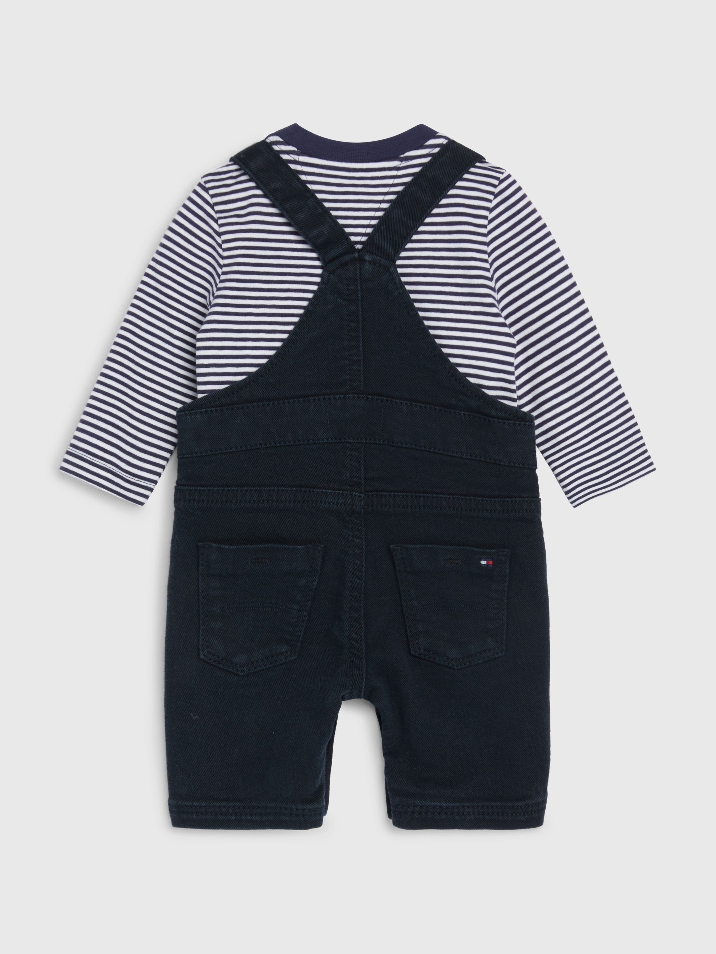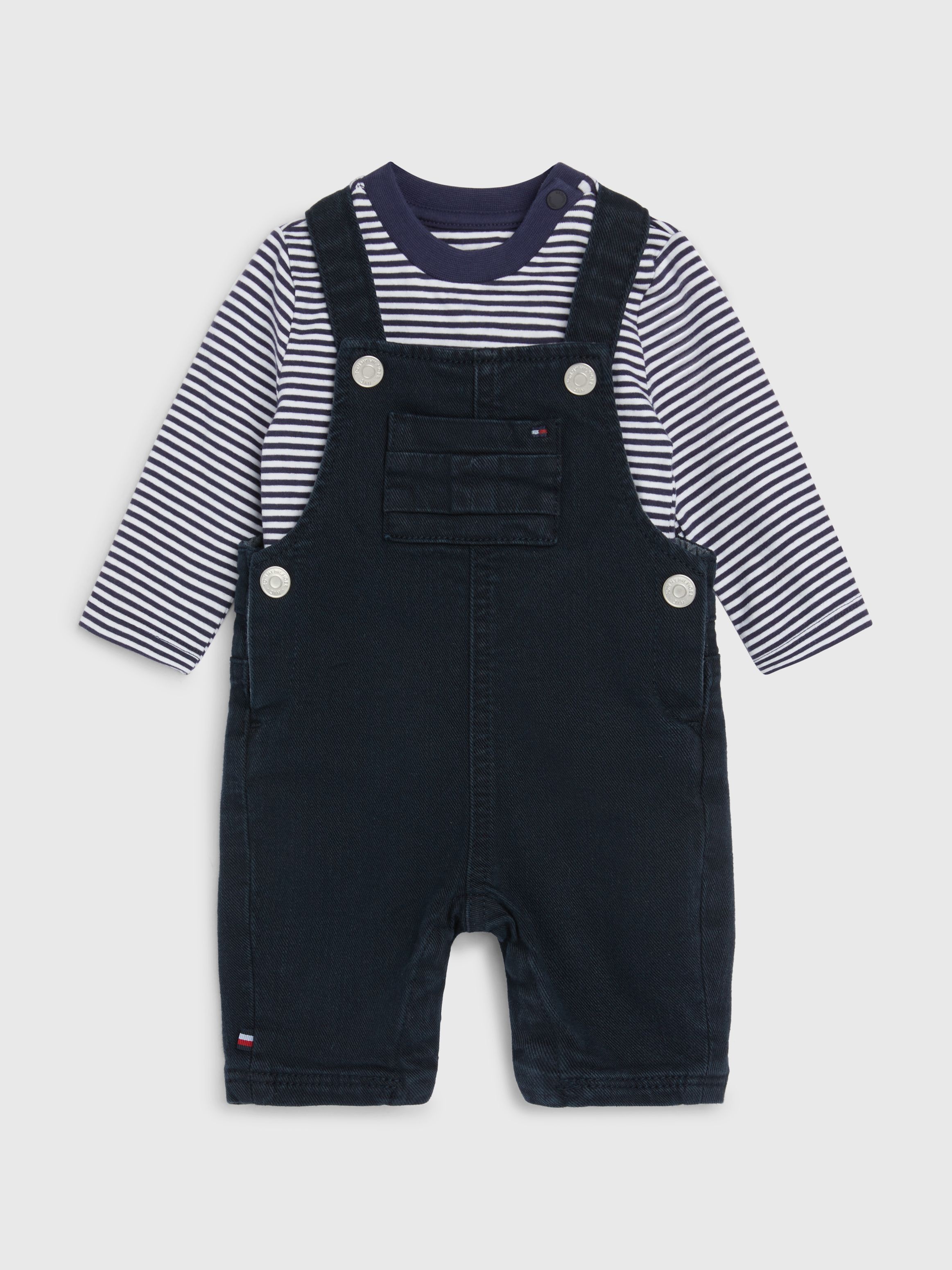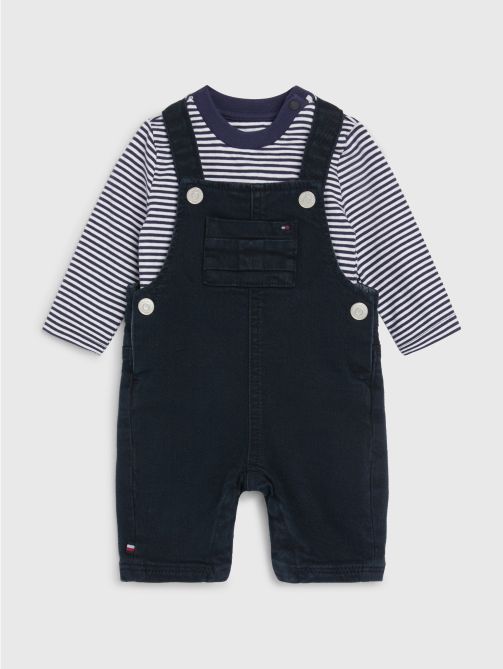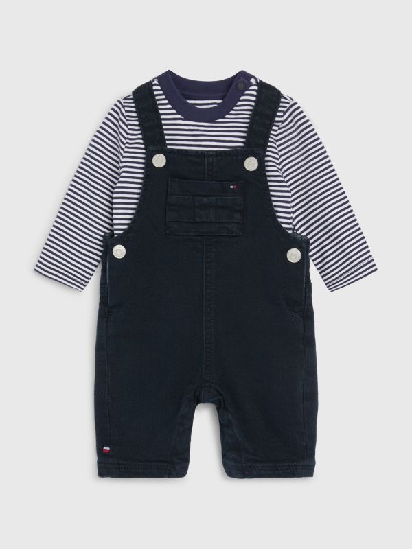 يتميز هذا الطقم المريح للأطفال المكون من قطعتين بتيشيرت مخطط بأكمام طويلة وسالوبيت جينز بخطوط بأشرطة على الجوانب.