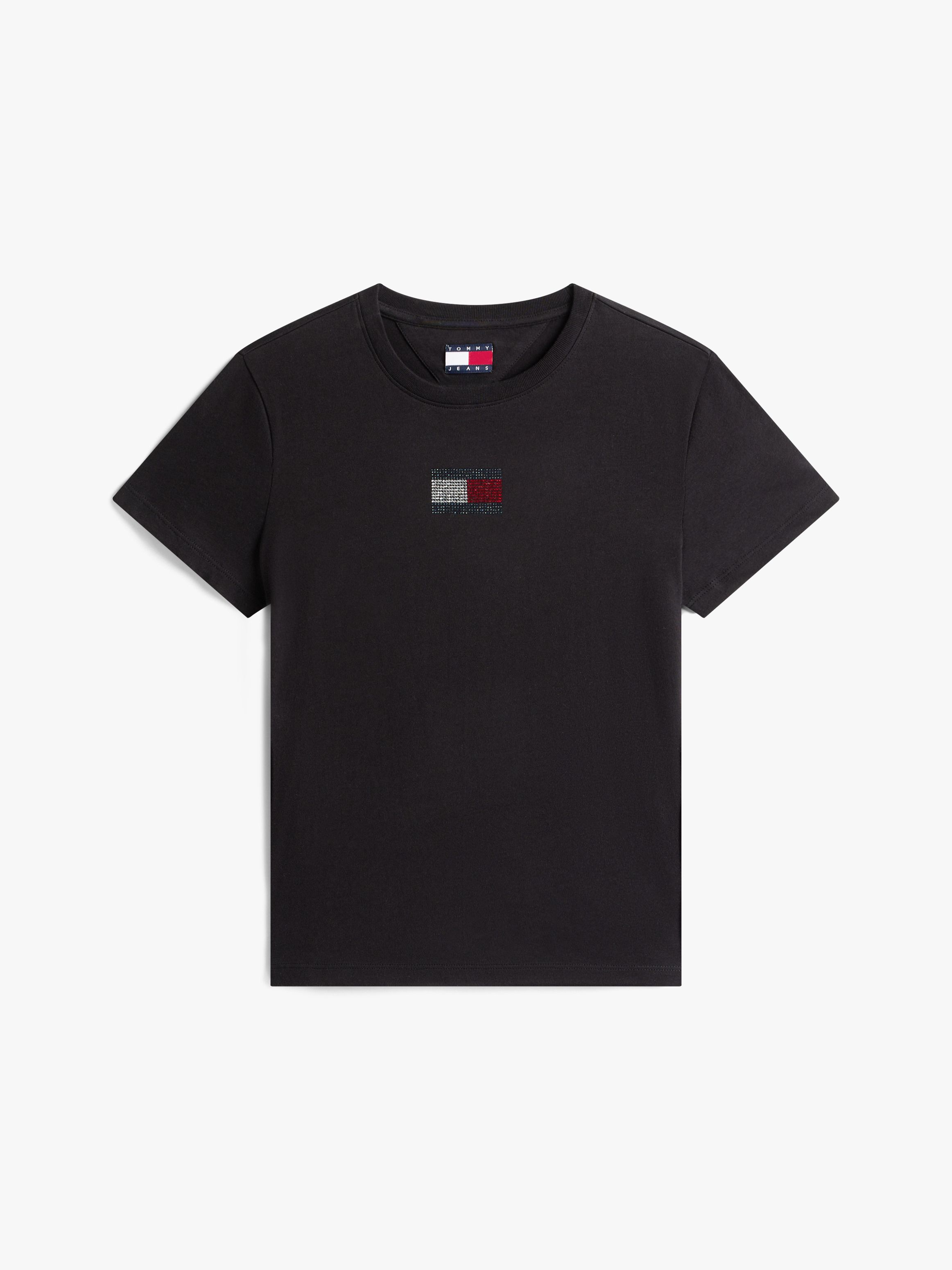 أضيفي لمسة من البريق إلى إطلالاتك الكاجوال مع هذا التيشيرت المصنوع من قطن جيرسي نقي، ويزدان بعلم Tommy Jeans المرصّع بالكريستال على الجهة الأمامية ليجمع بين الراحة والأناقة اللافتة.
