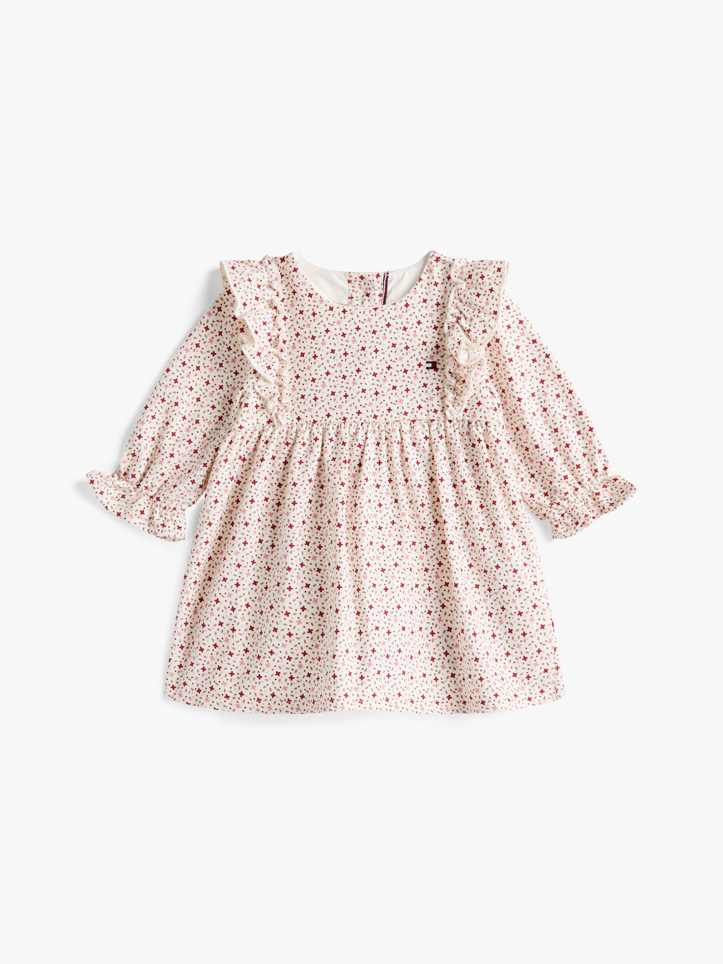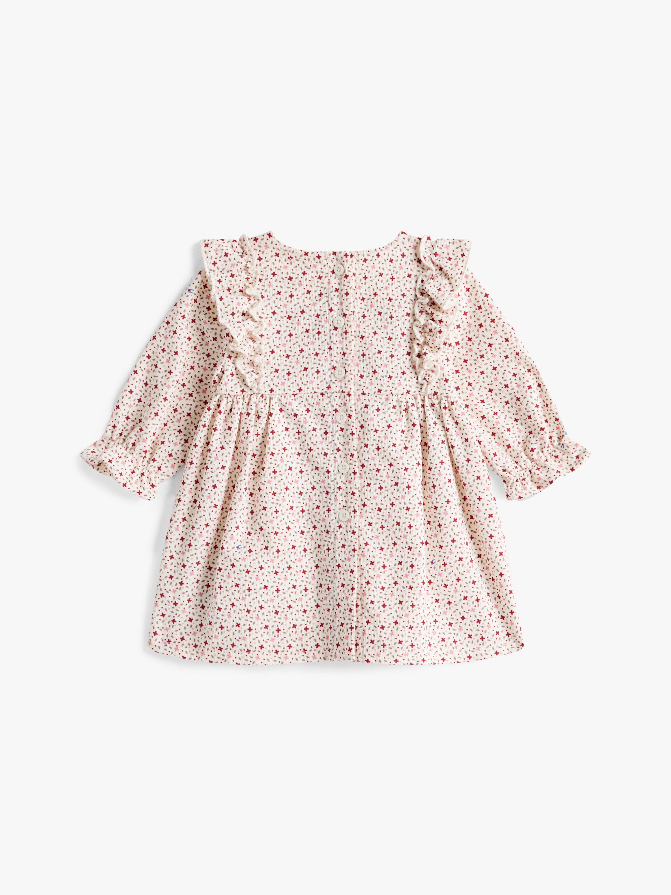 تألقي بإطلالة ناعمة وأنثوية مع فستان مريح من قماش الكوردوري بكشكشة وطبعة زهور، مصنوع من قطن نقي بنقشة زهرية رقيقة وتفاصيل كشكش على الأكتاف تضيف له لمسة حيوية ومميزة.