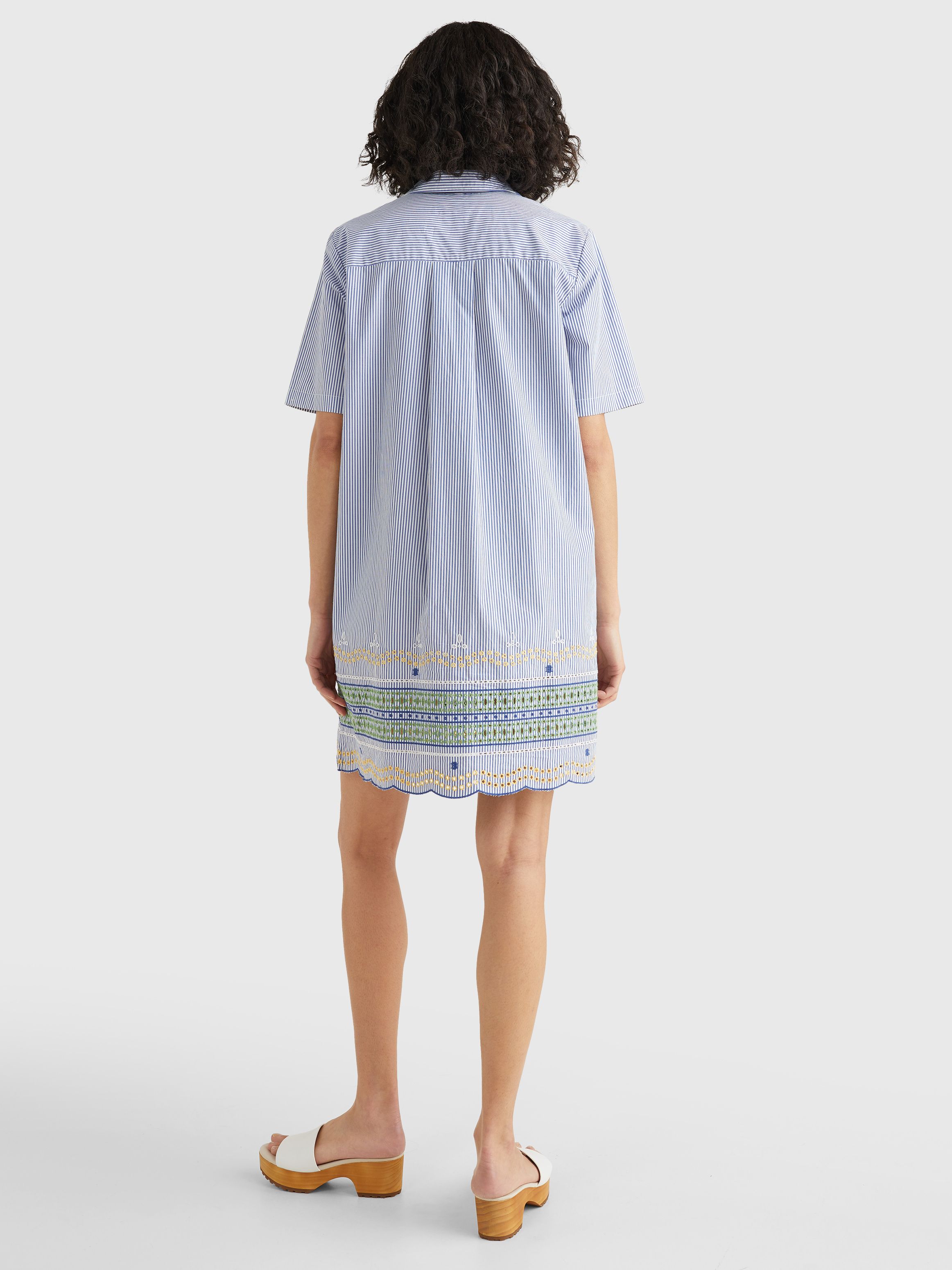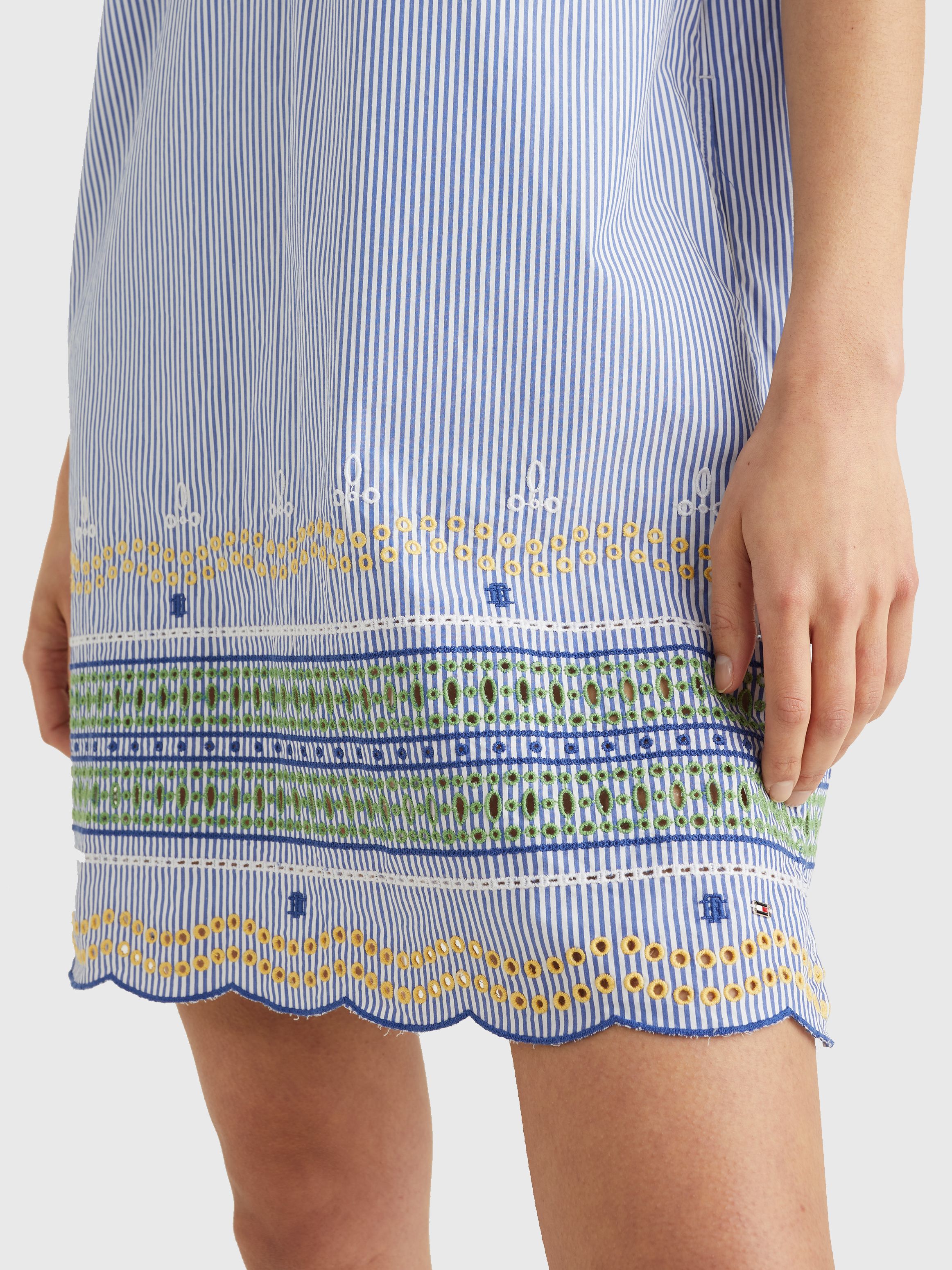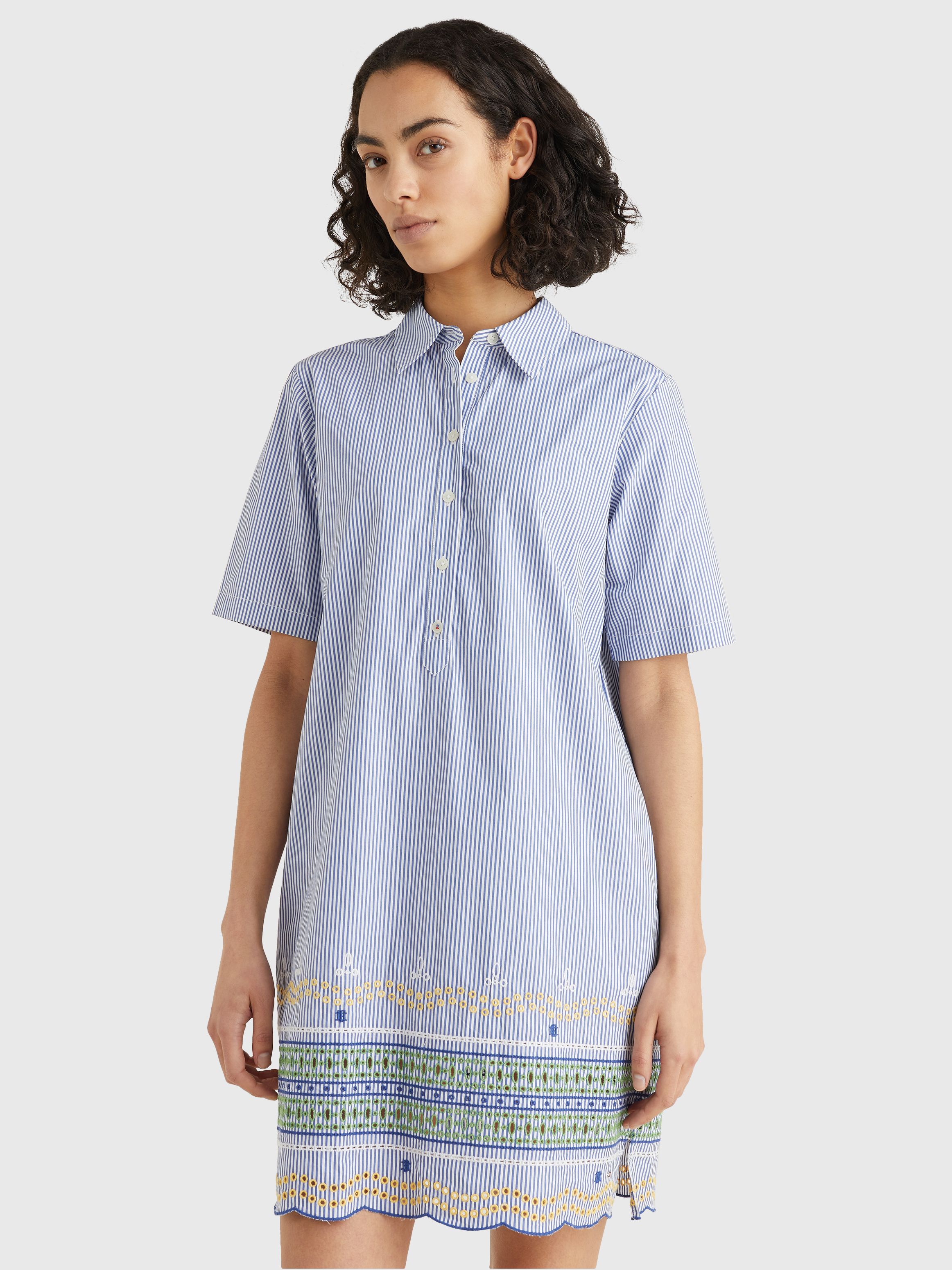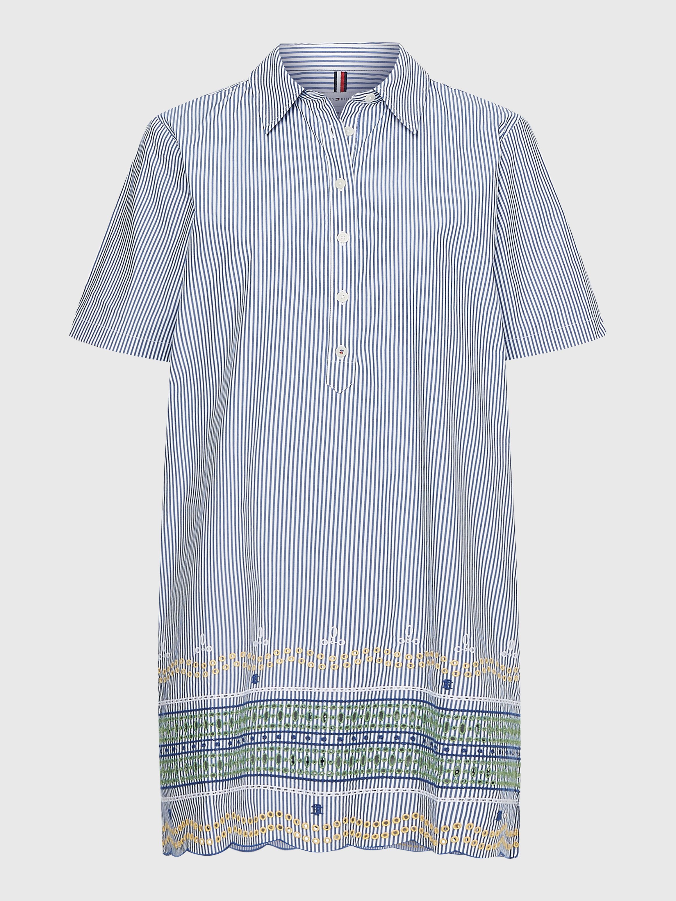 • قطن عضوي نقي • طبعة خطوط • ياقة واسعة • فتحة ذات ستة أزرار • تطريز دانتيل عند الحافة • حافة بتصميم متعرج • تطريز حرف واحد فقط على الحافة • علامة تومي هيلفيغر التجارية