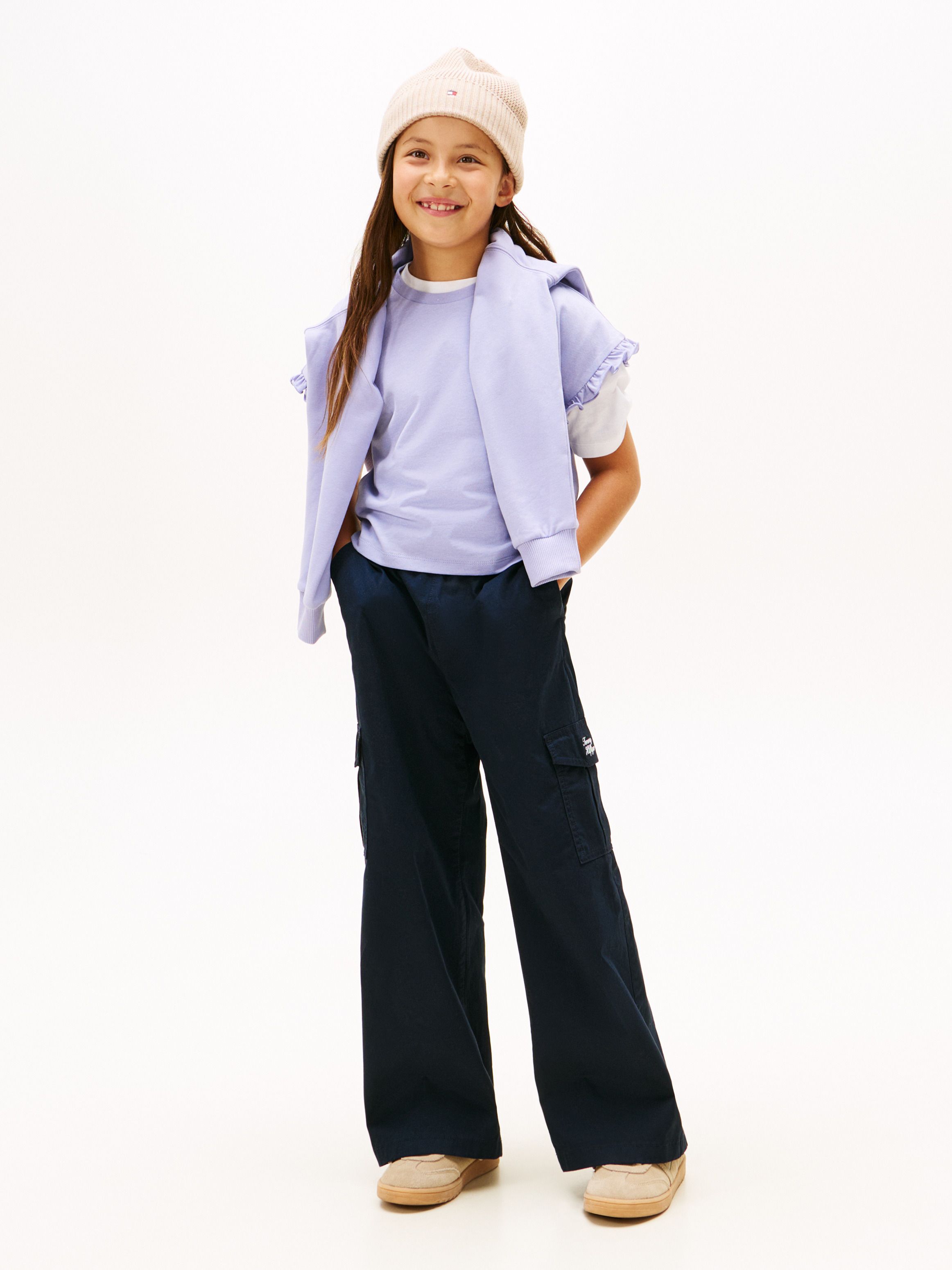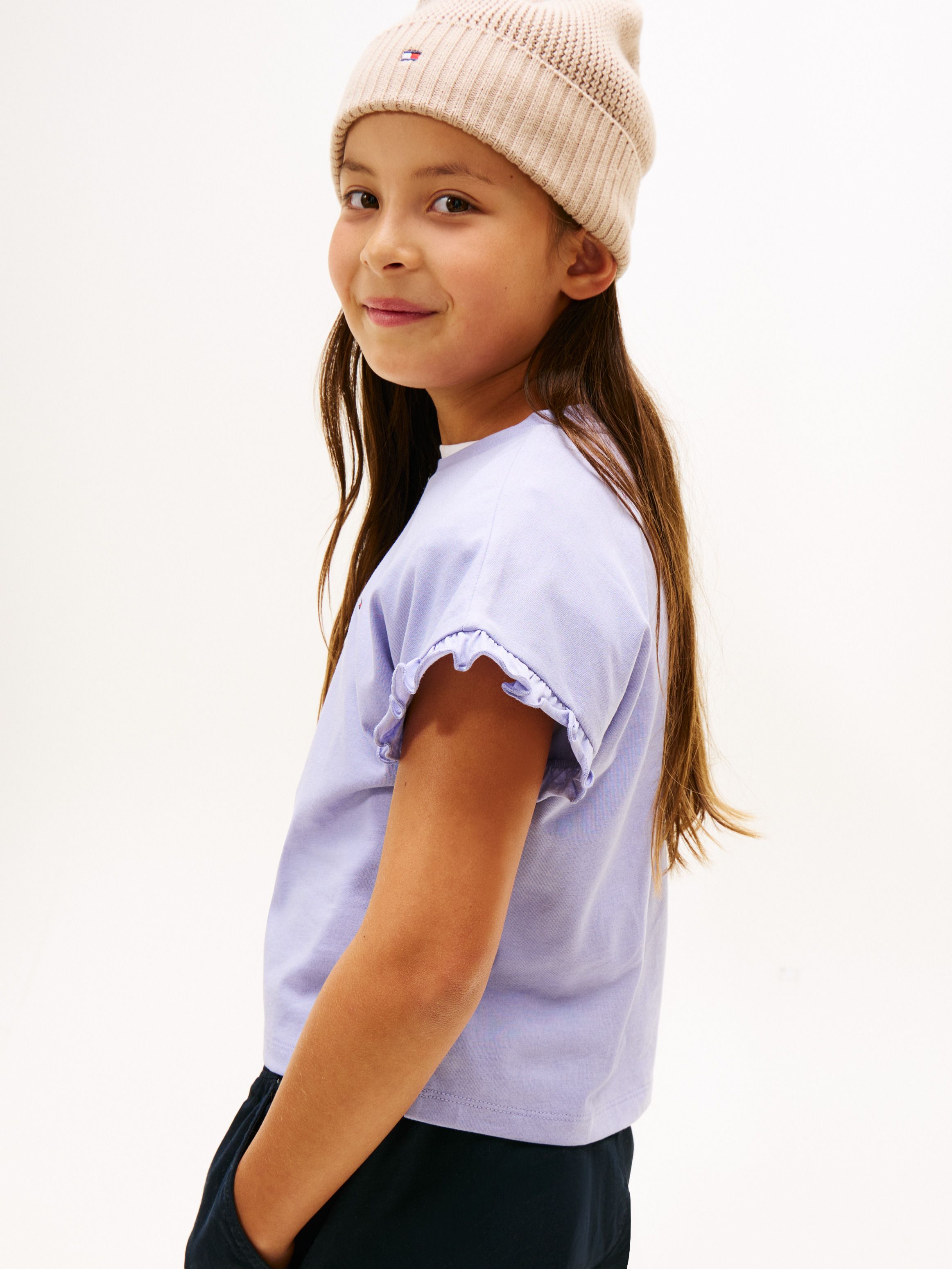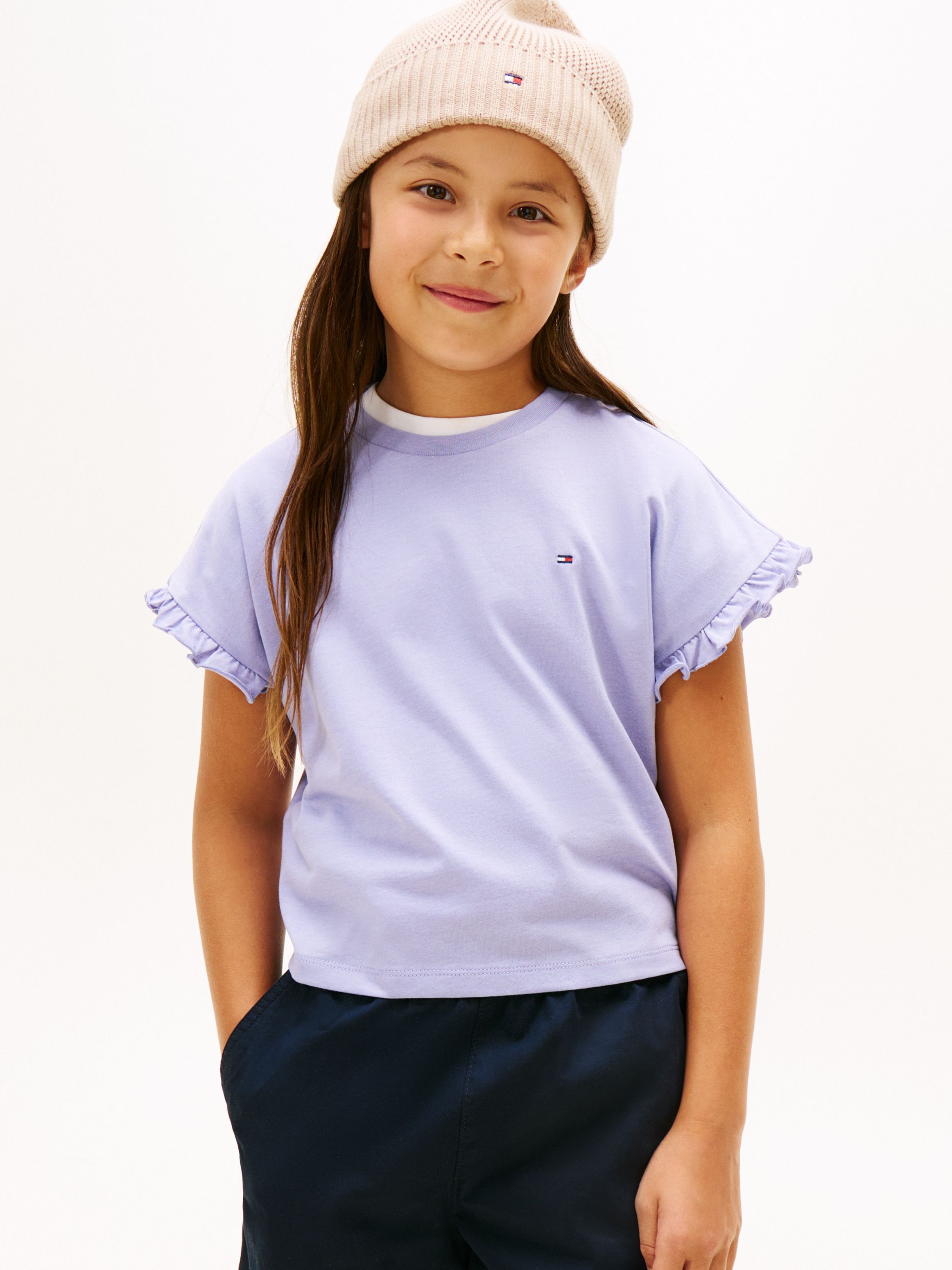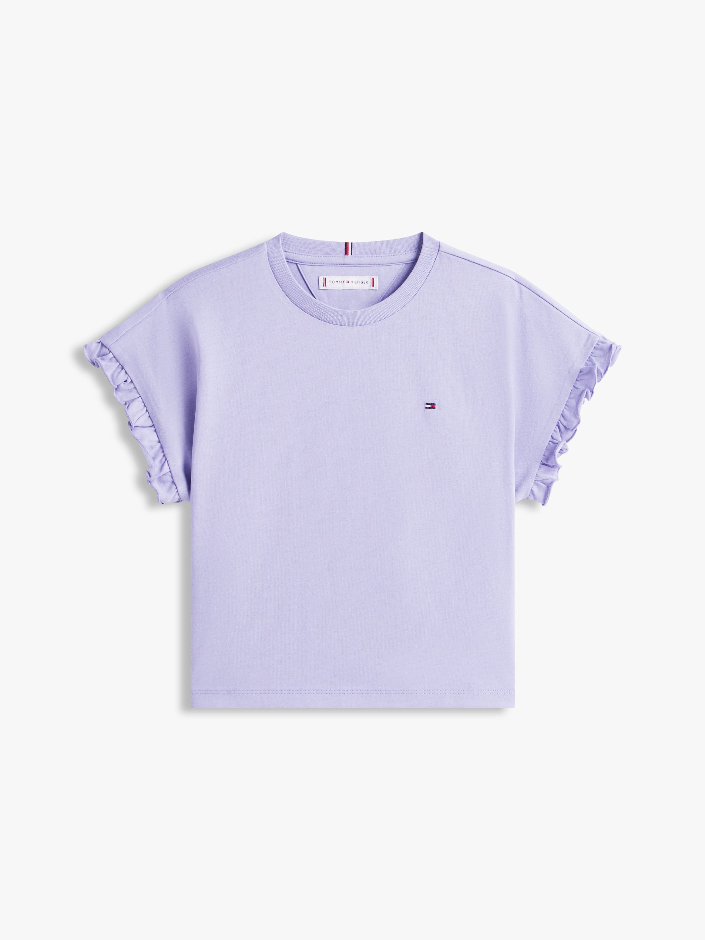 تم تصميم هذا القميص الجيرسي بطابع كلاسيكي بقصة مريحة، مع شريط يحمل العلامة المميّزة ولمسة نهائية بكشكشة ناعمة على الأكمام.