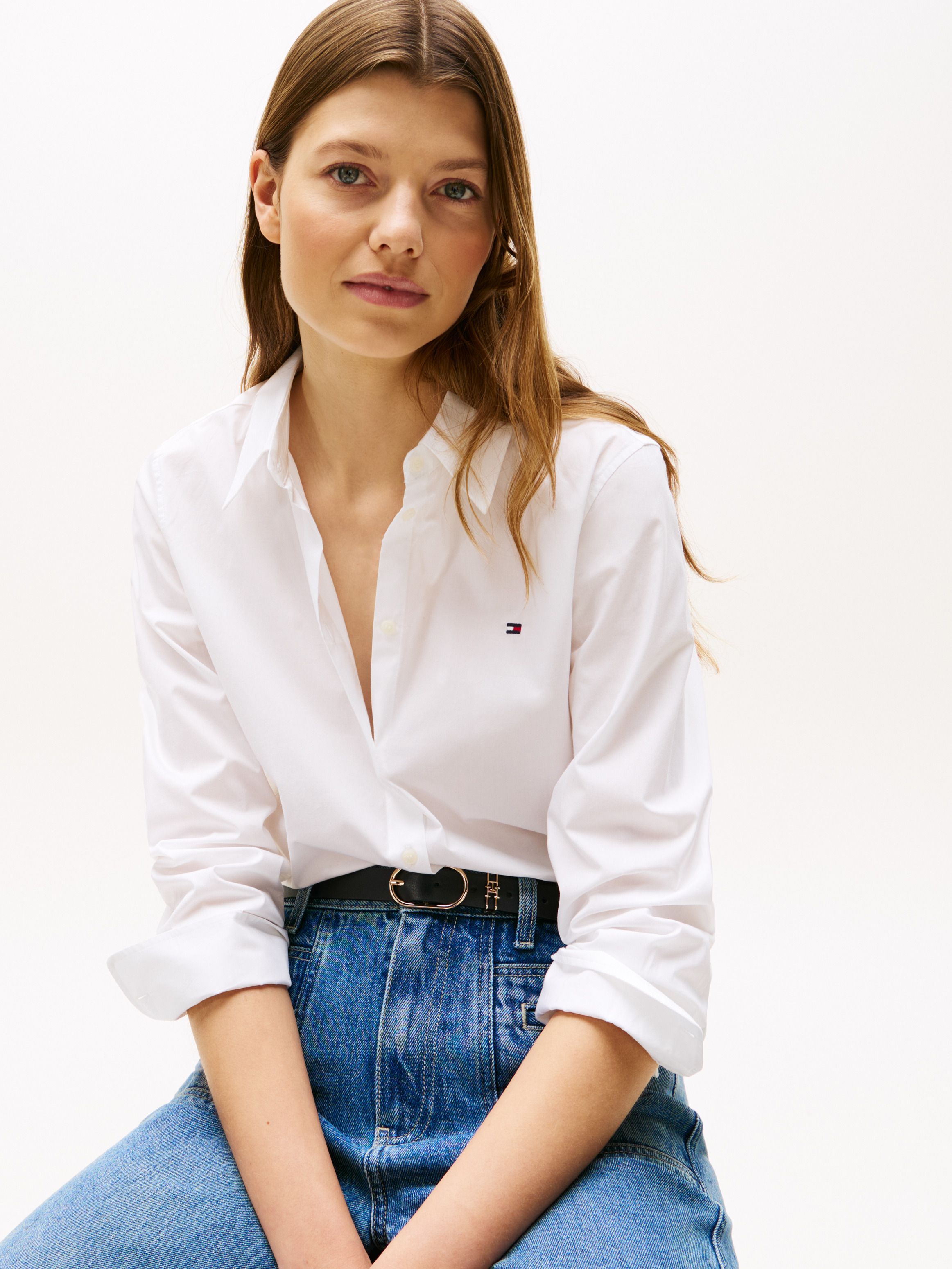 جدّدي أساسيات خزانة ملابسك مع هذا القميص المصنوع من قطن قابل للتمدد، بلمسة أنيقة من تطريز علم تومي هيلفيغر على الصدر.