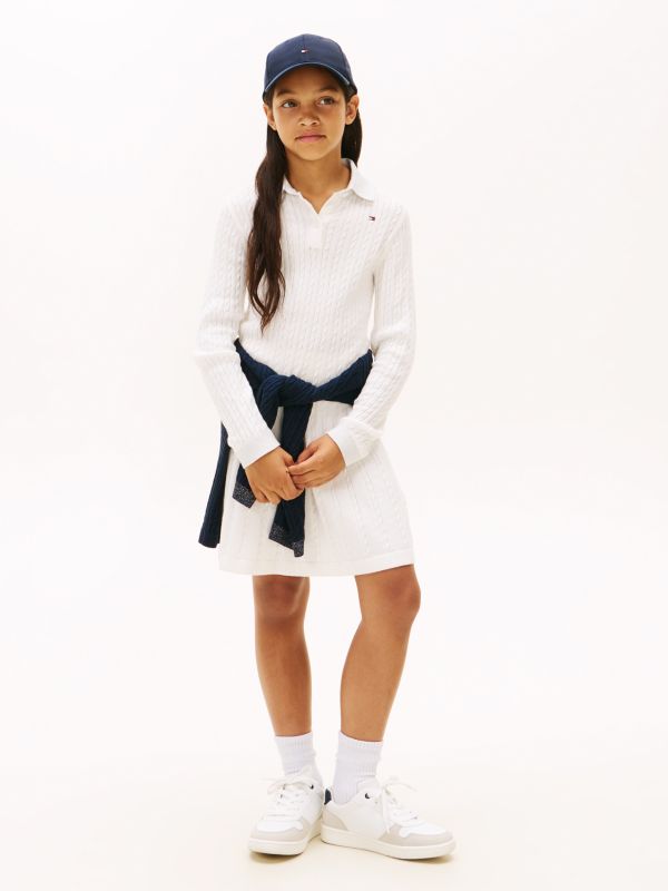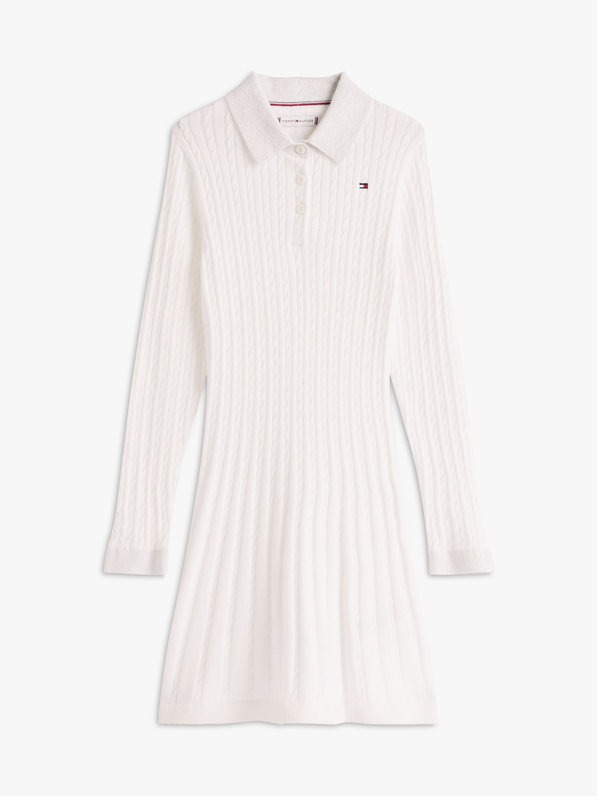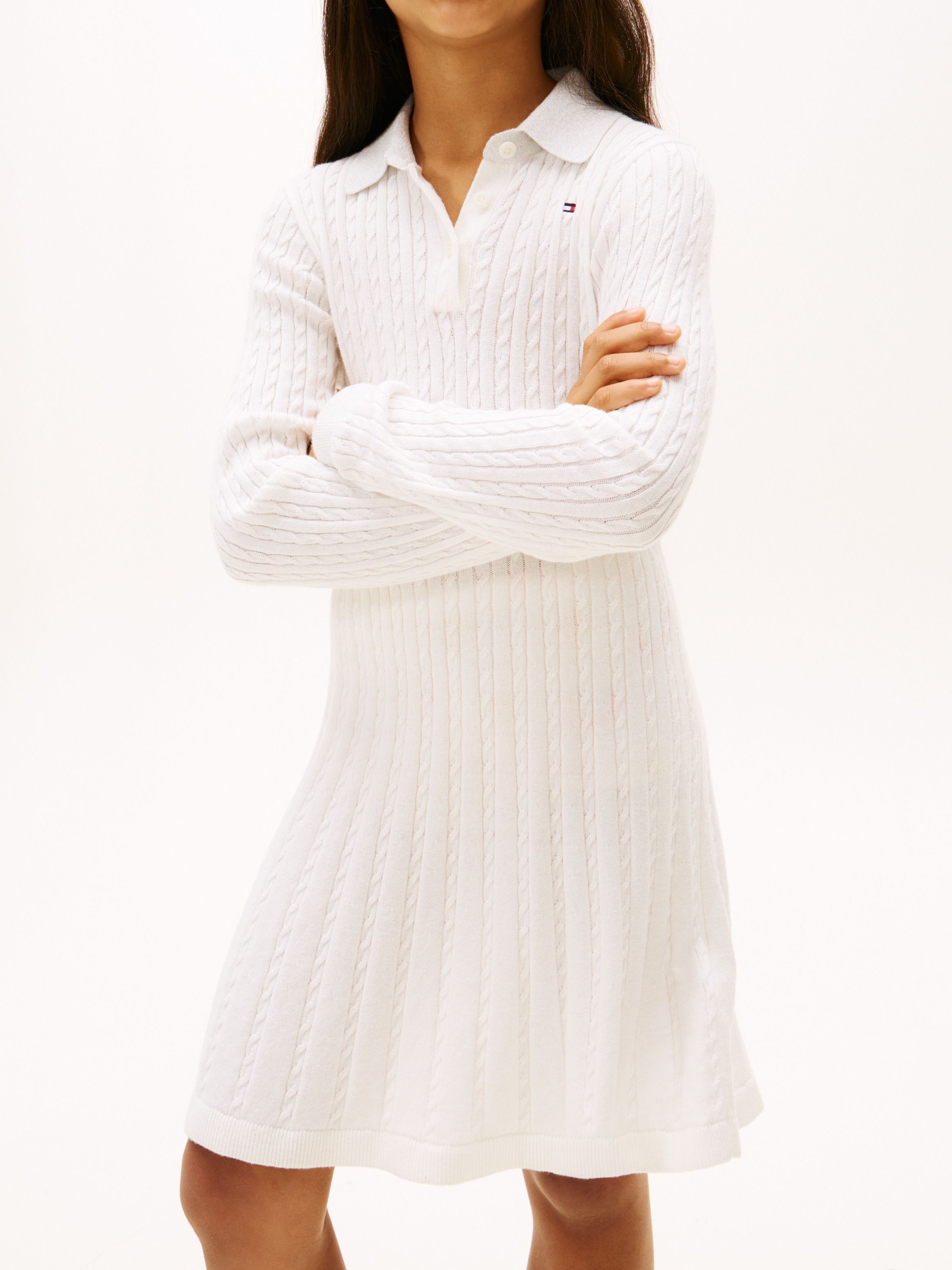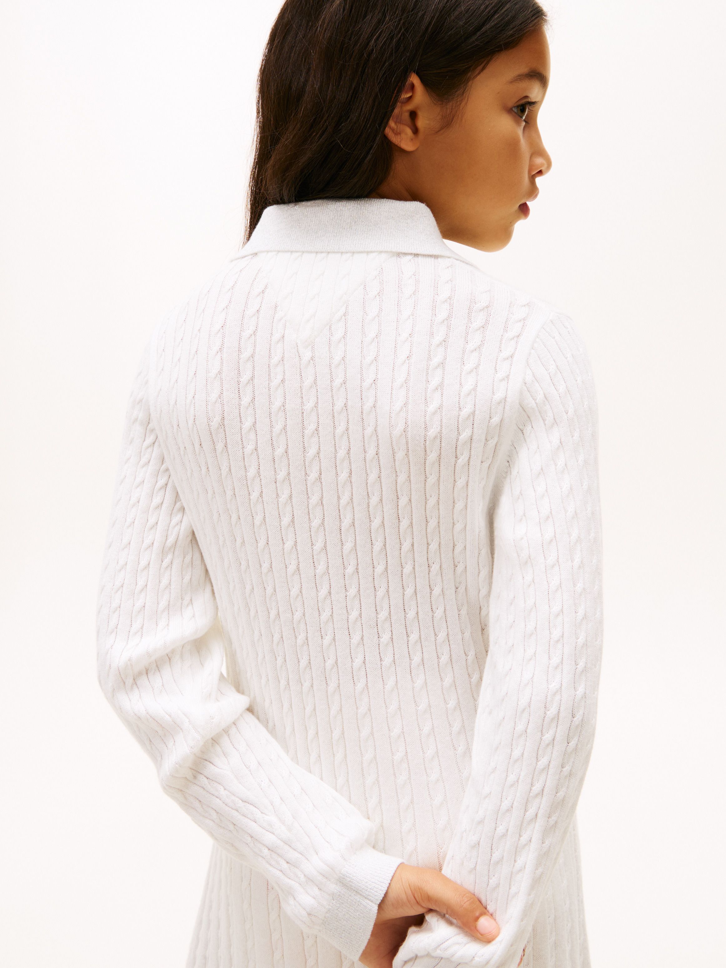 يأتي هذا الفستان المحبوك والمزيّن بنقشة الضفيرة الدقيقة على كامل السطح بلمسة احتفالية مميّزة، بفضل الخيط اللامع على الياقة والأساور.