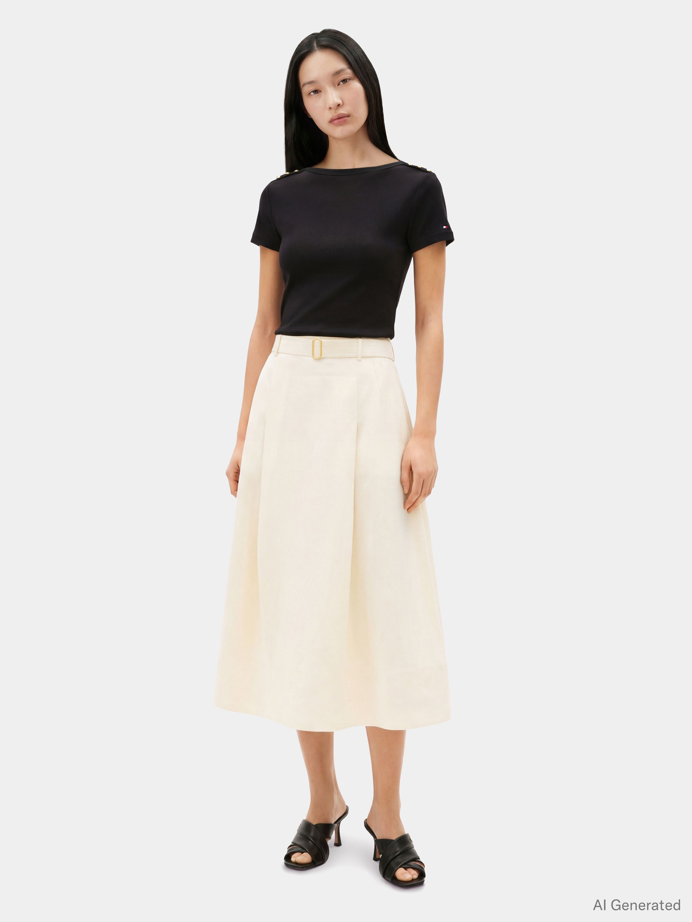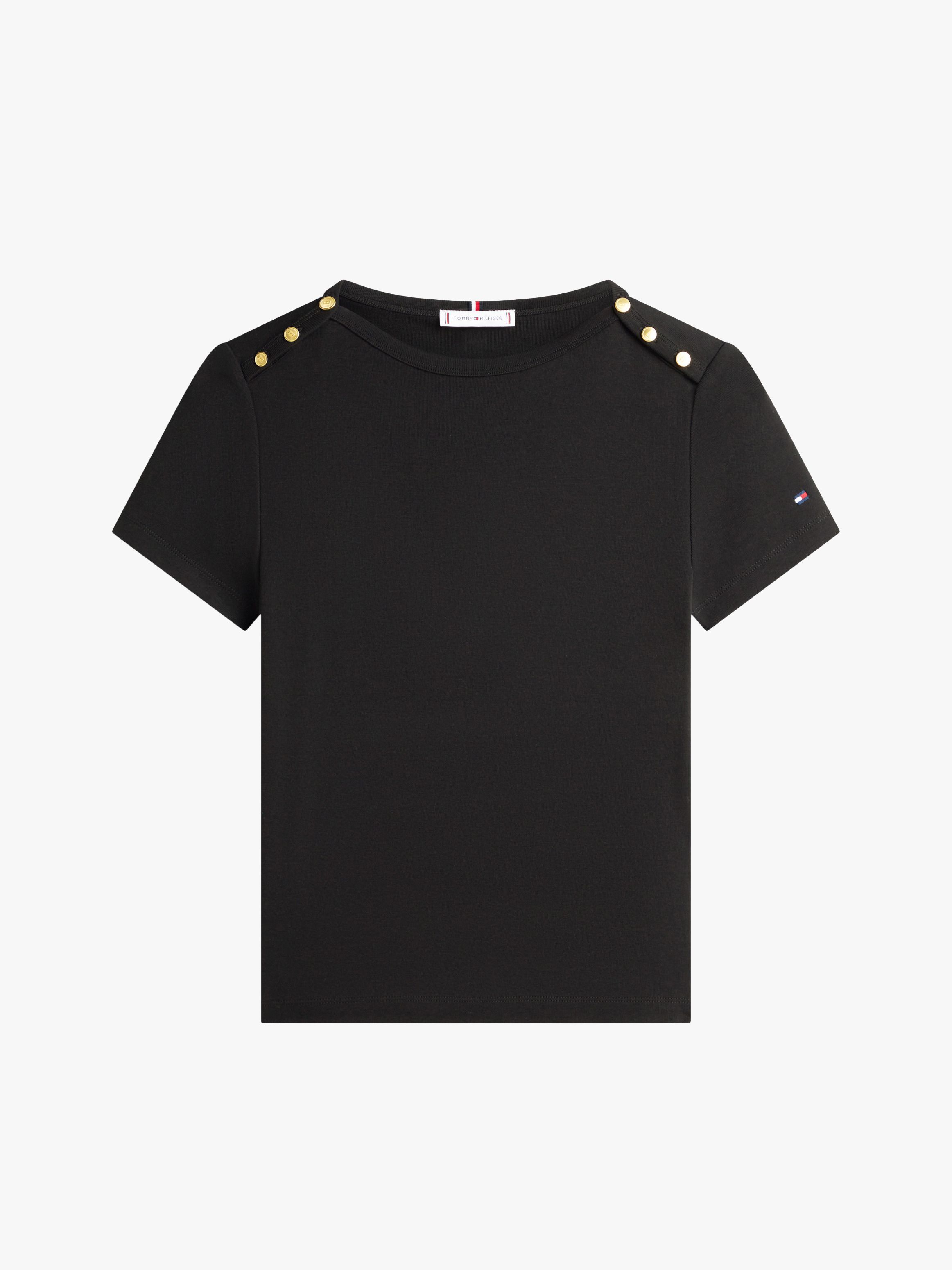 • تيشيرت بقصة ضيقة بياقة قارب مزين بأزرار ذهبية