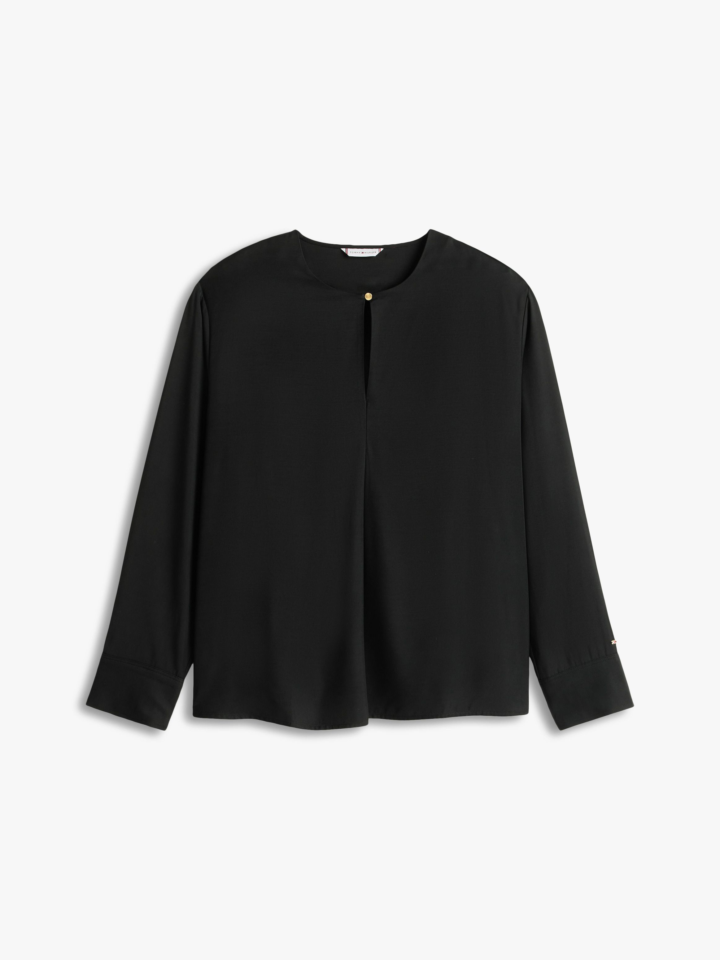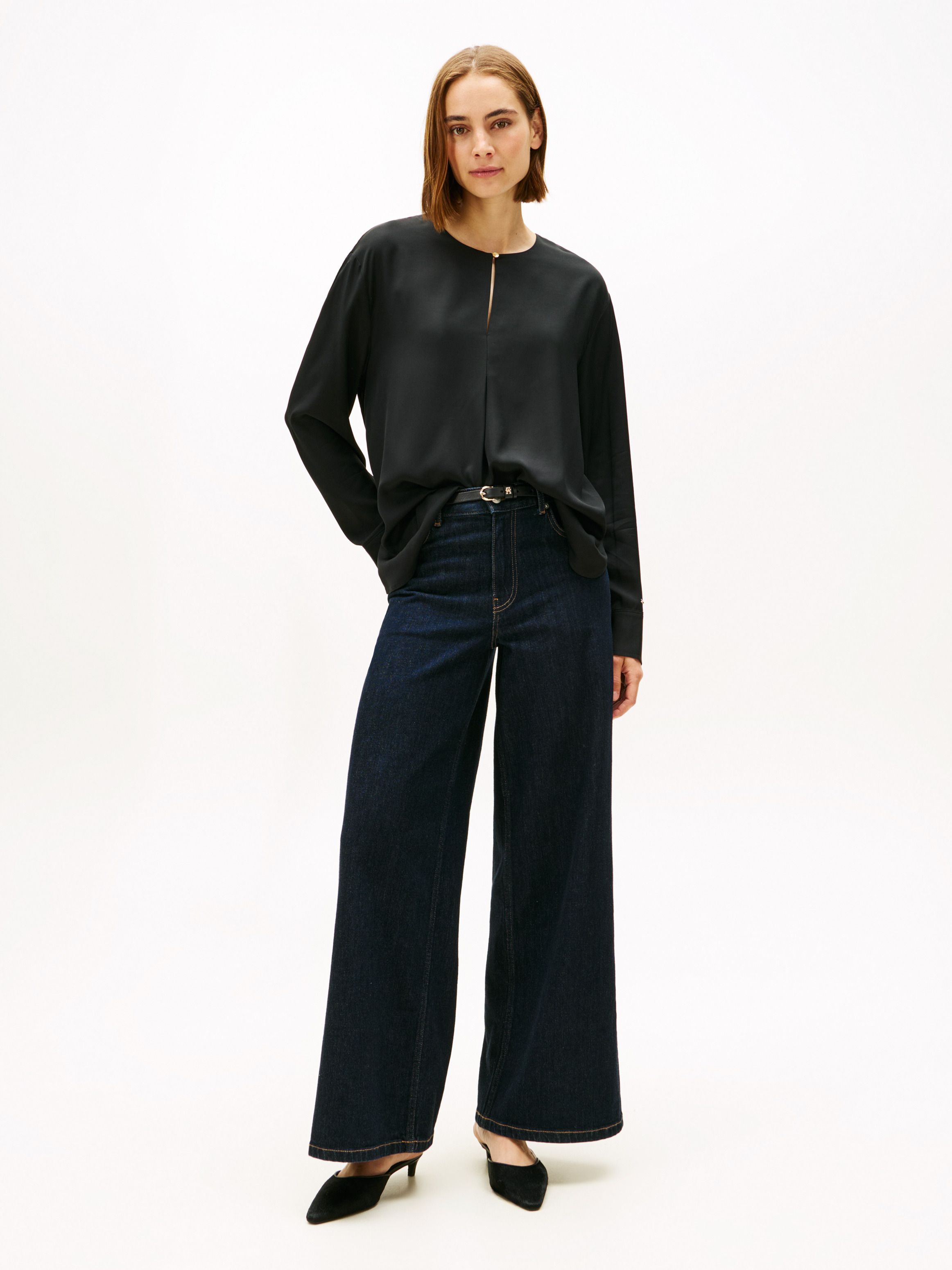 أسلوب أنيق لخزانة عملك، تأتي هذه البلوزة الواسعة بتفصيل ثني حاد من الأمام وفتحة زر أمامية لإضافة لمسة راقية. أبرز التفاصيل • تويل الفيسكوز • ياقة دائرية عالية • فتحة أمامية مغلقة بزر • ثنية أمامية • أكمام بأزرار مفردة • شعار تومي هيلفيغر • علم تومي هيلفيغر منقوش على الأزرار • علم معدني لتومي هيلفيغر على الكم القصة والمقاس • قصة مريحة • أكتاف منخفضة قليلاً • طول العارضة 1.76 متر وترتدي مقاس 8 الخامة والعناية • 100% فيسكوز