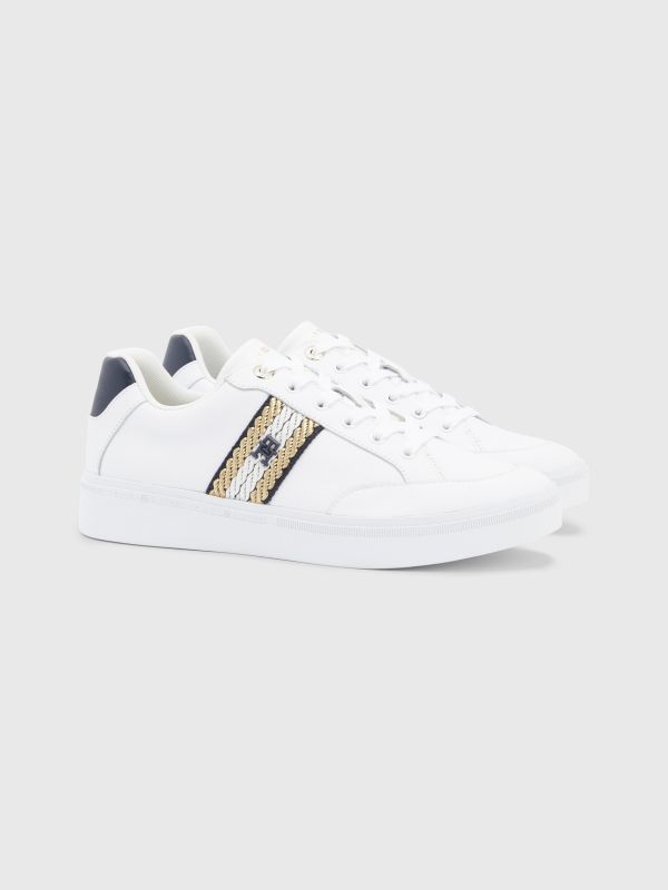 احصلي على حذاء سنيكرز مصنوع من القطن العضوي النقي، ومزين بشعار تومي هيلفيغر الشهير ليضيف لمسة عصرية إلى ملابسك.