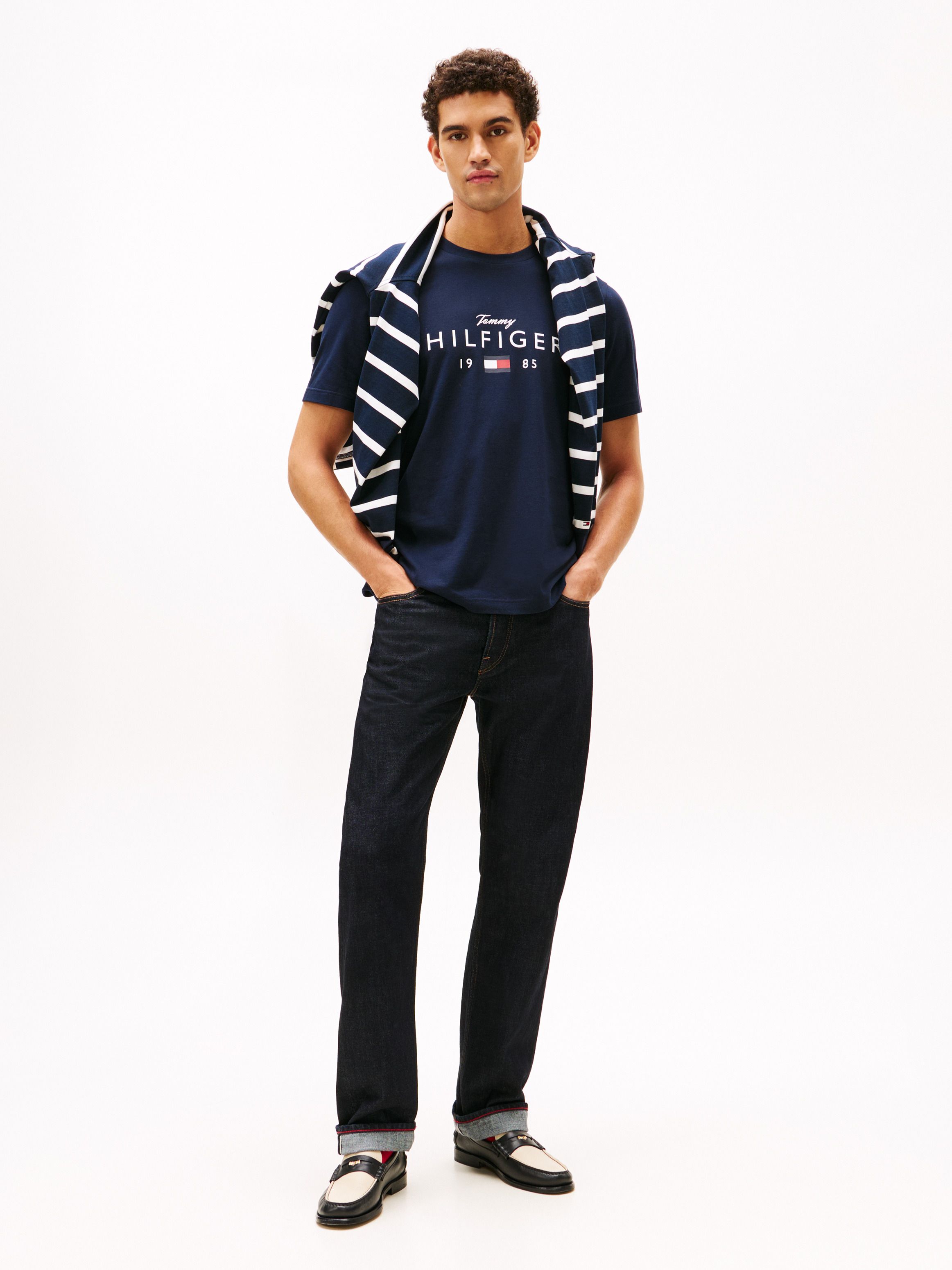 تيشيرت مصنوع من جيرسي القطن النقي بتصميم كلاسيكي، مزود بطبعة شعار واضحة مع علم العلامة عبر الصدر لمنحك لمسة أيقونية.