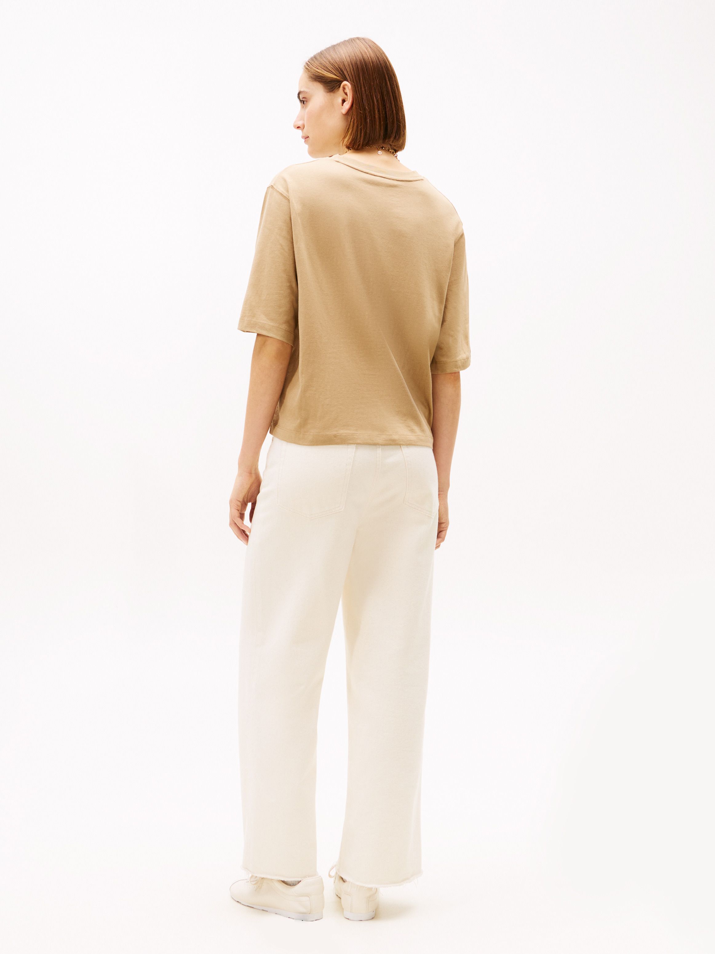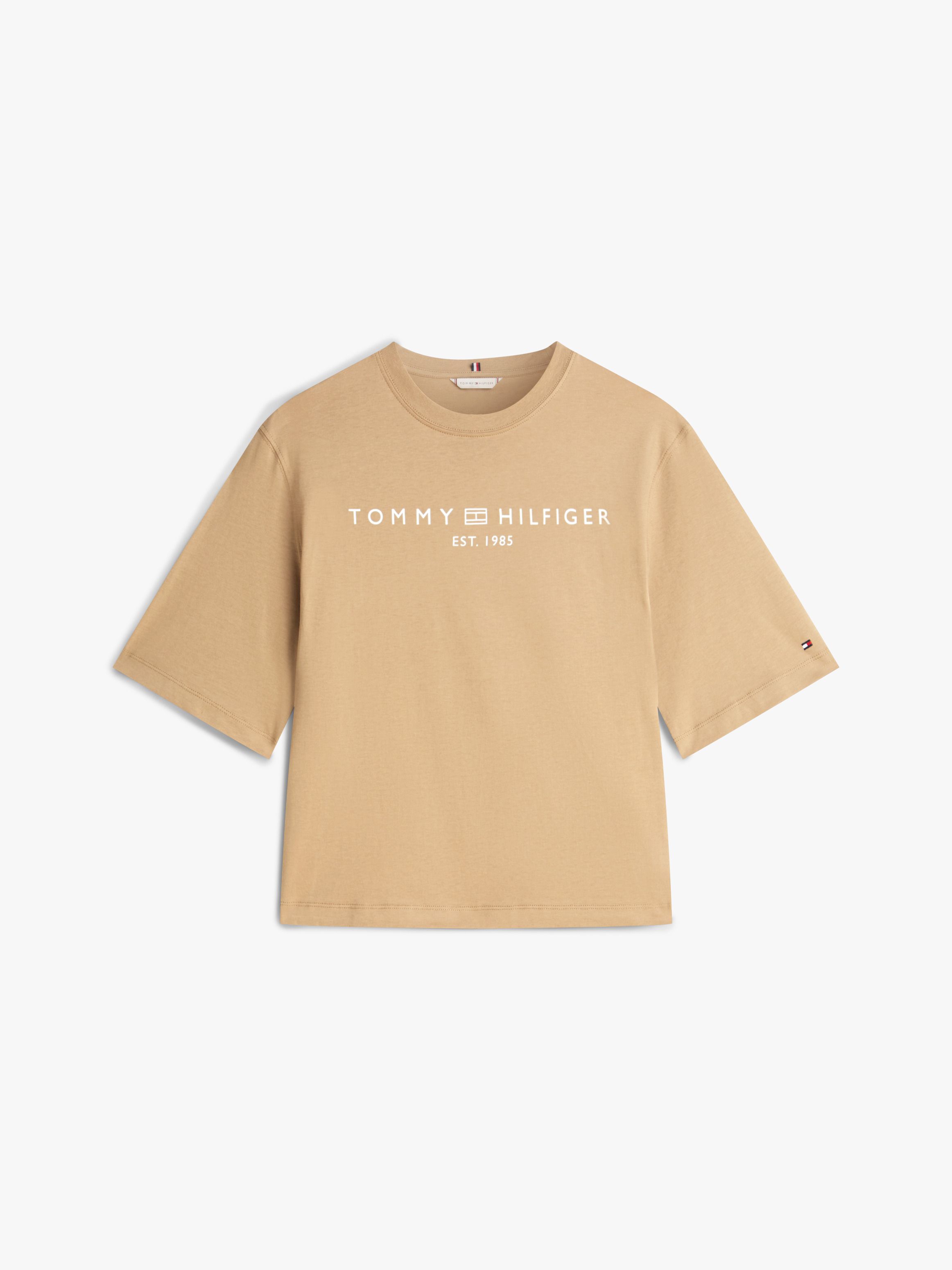 تيشيرت بياقة دائرية يقدم لمسة عصرية على تصميم الشعار الكلاسيكي، ويأتي بقصّة مريحة وأكمام بثلاثة أرباع على شكل شبه منحرف لمظهر حديث ومميّز.