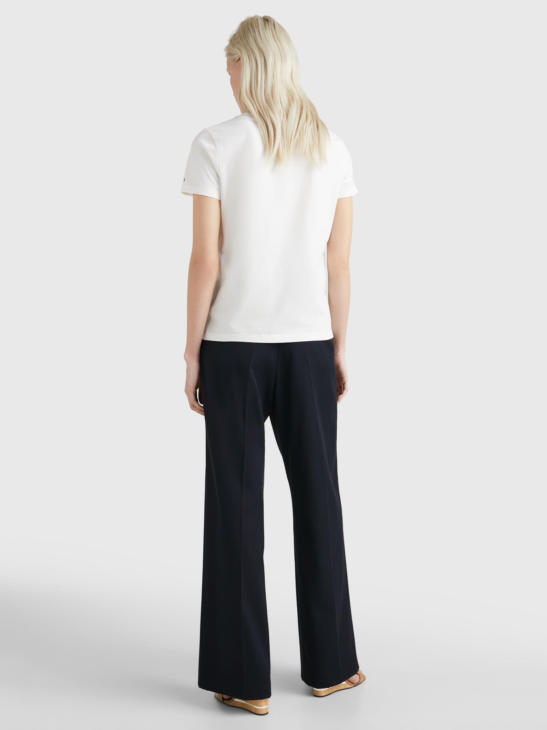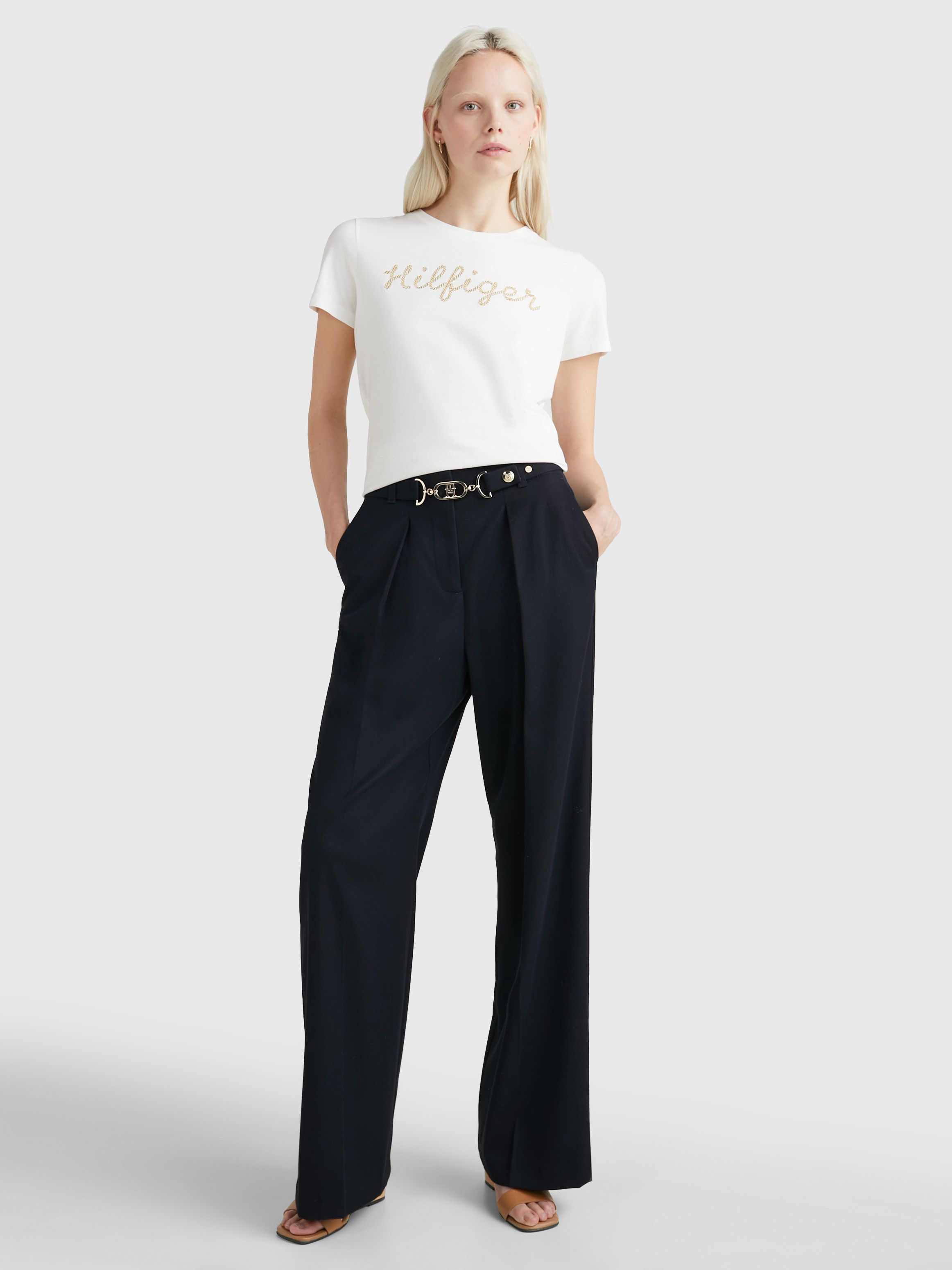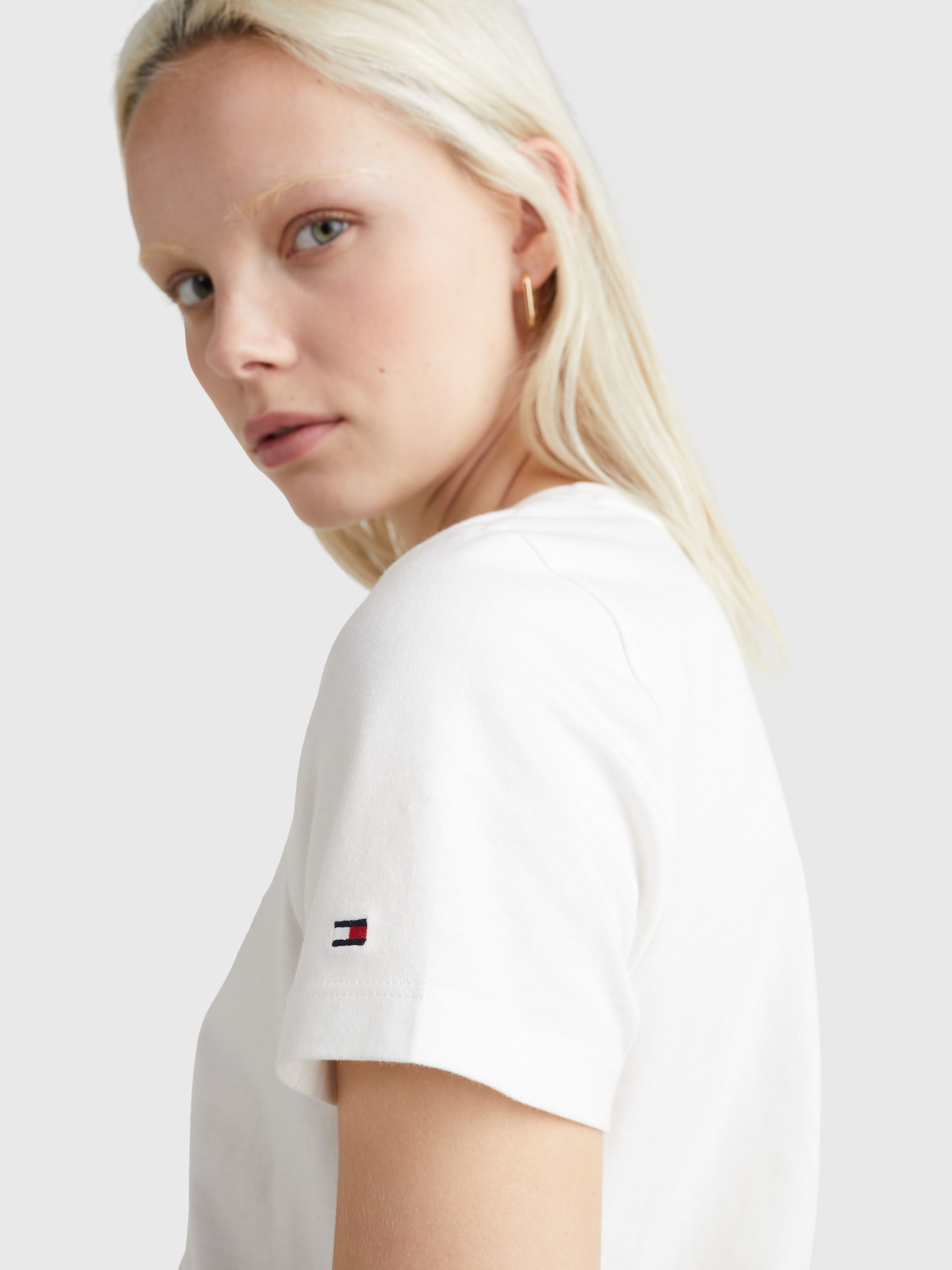 احصلي على مظهر يومي أنيق مع تيشيرت بقصة عادية، يتميز بطبعة شعار كبير الحجم وتصميم مميز على الأكمام.