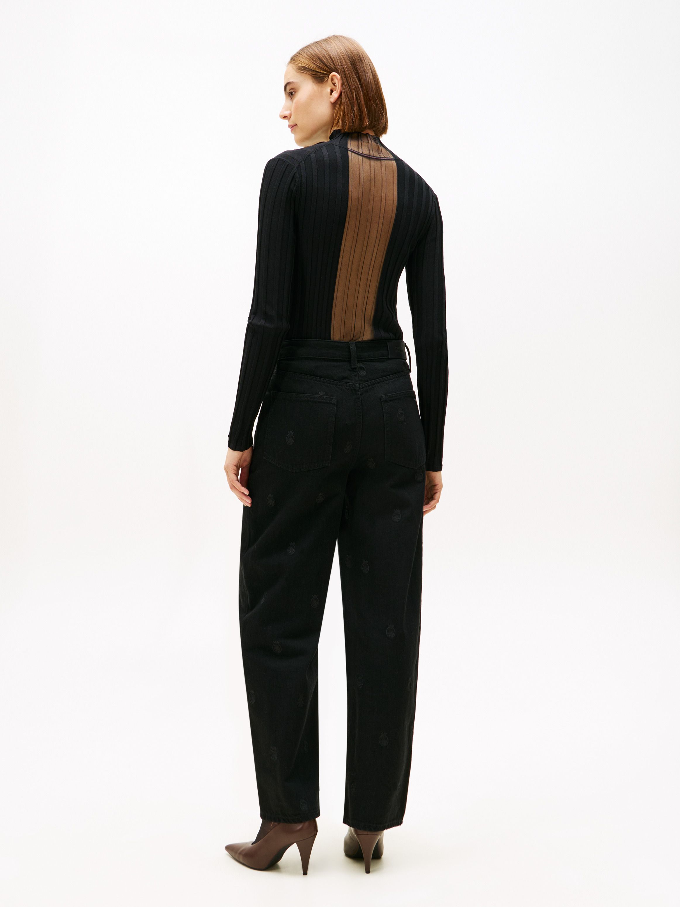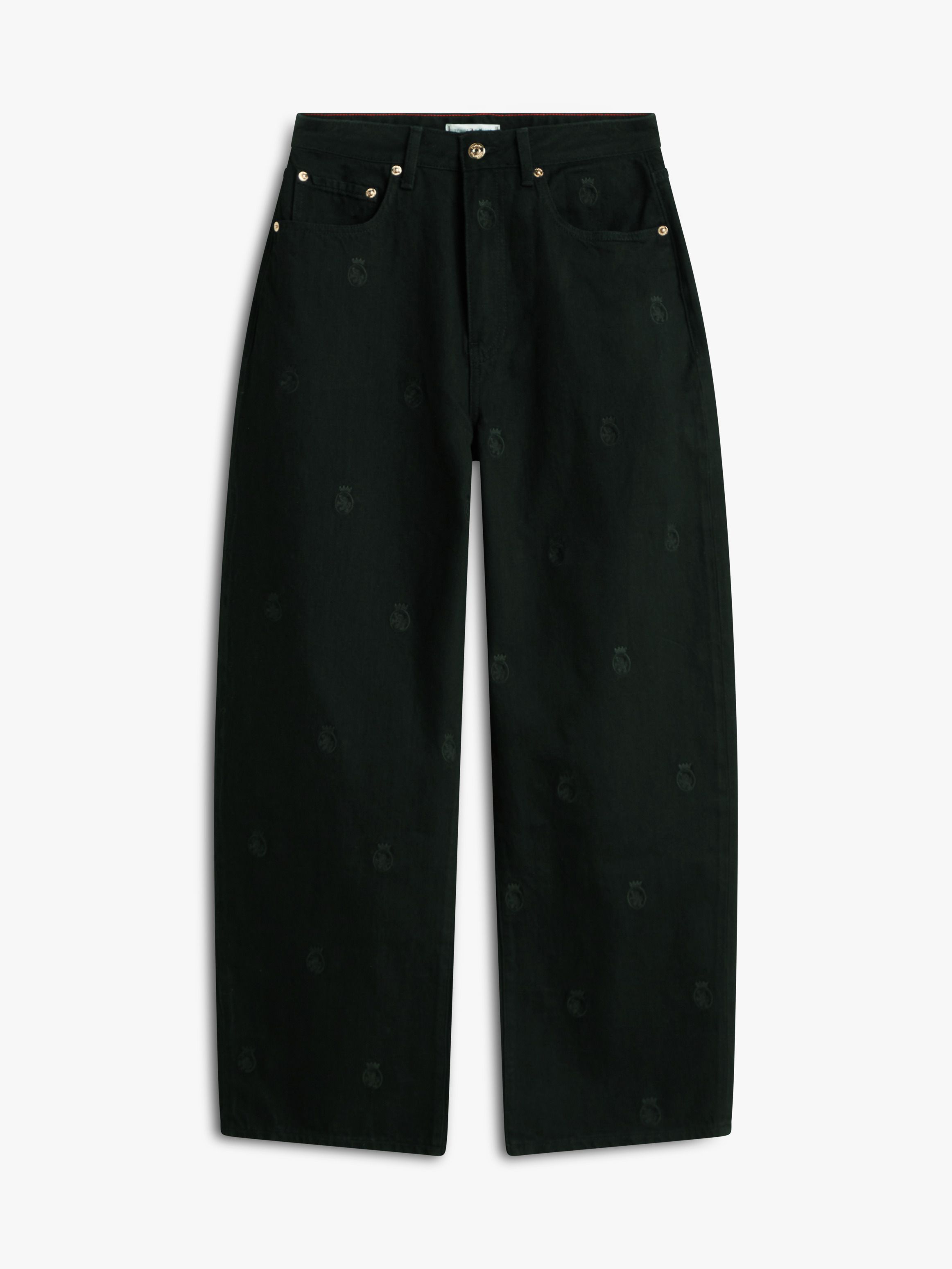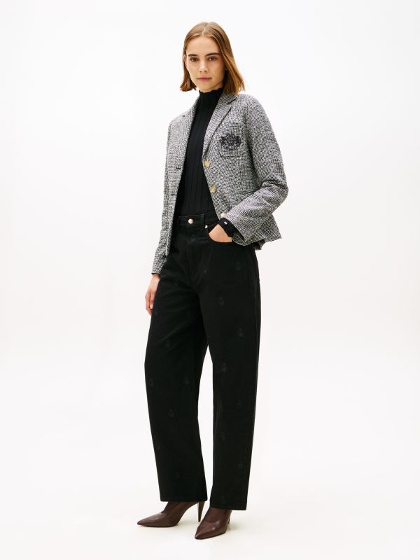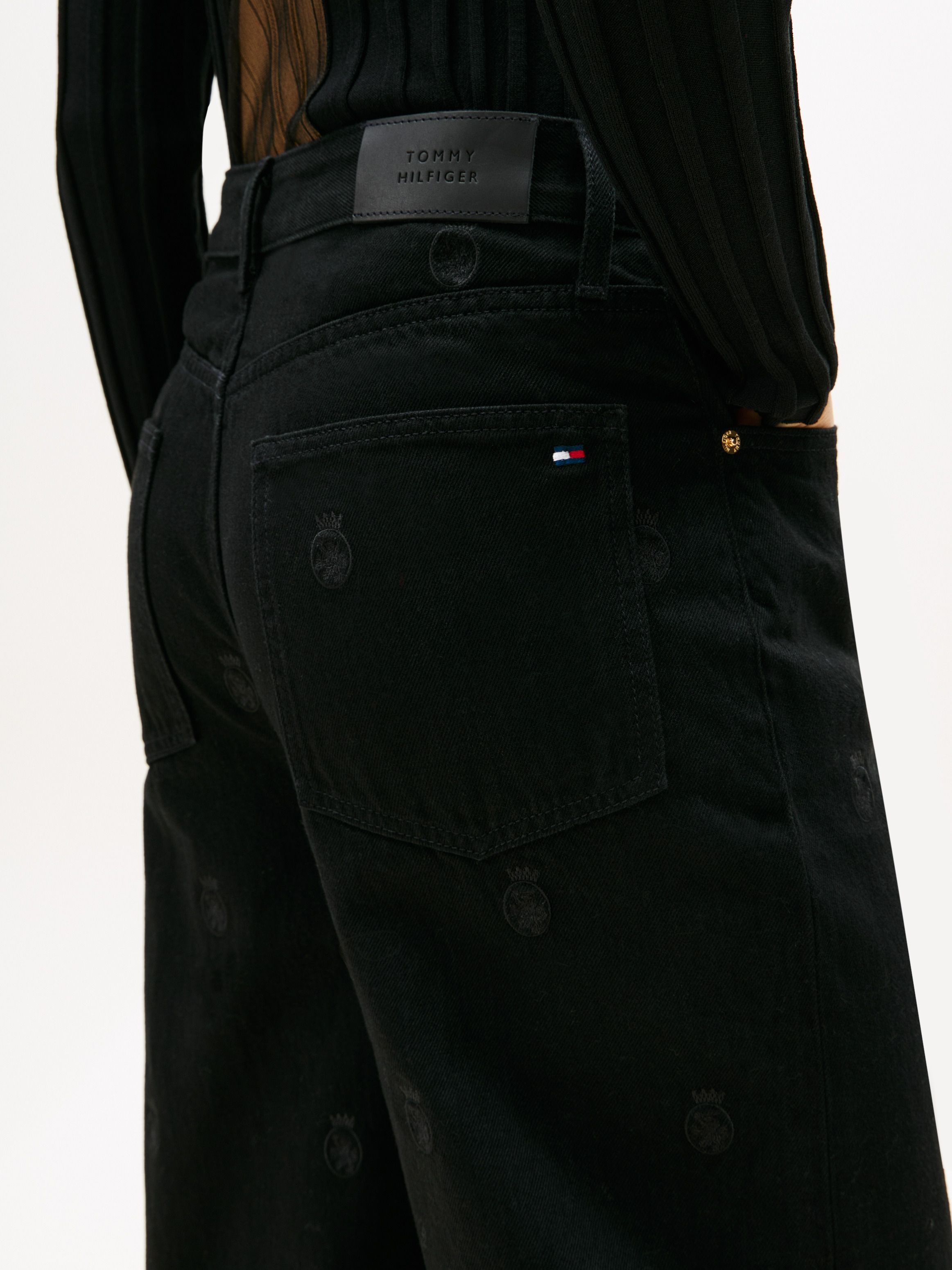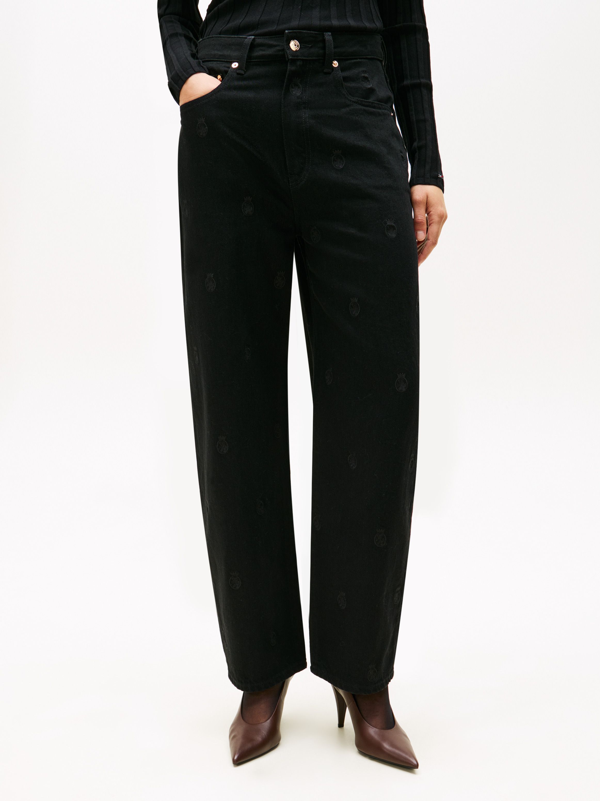 تتميز هذه البنطلونات السوداء بقصة ساق برميل لتوفير راحة وملاءمة واسعة، بينما يضيف التطريز الشامل لمسة شعار تومي هيلفيغر المميزة.