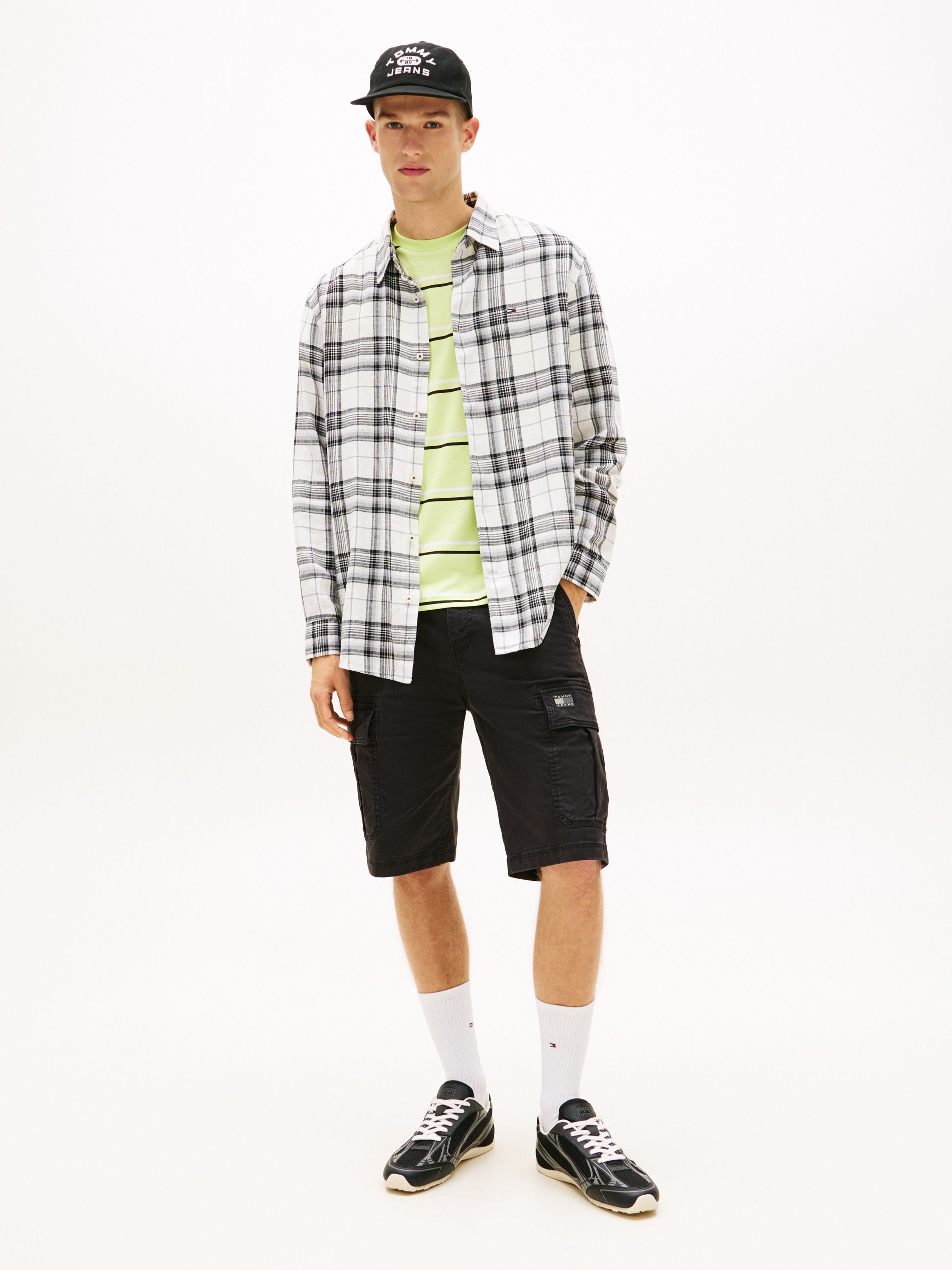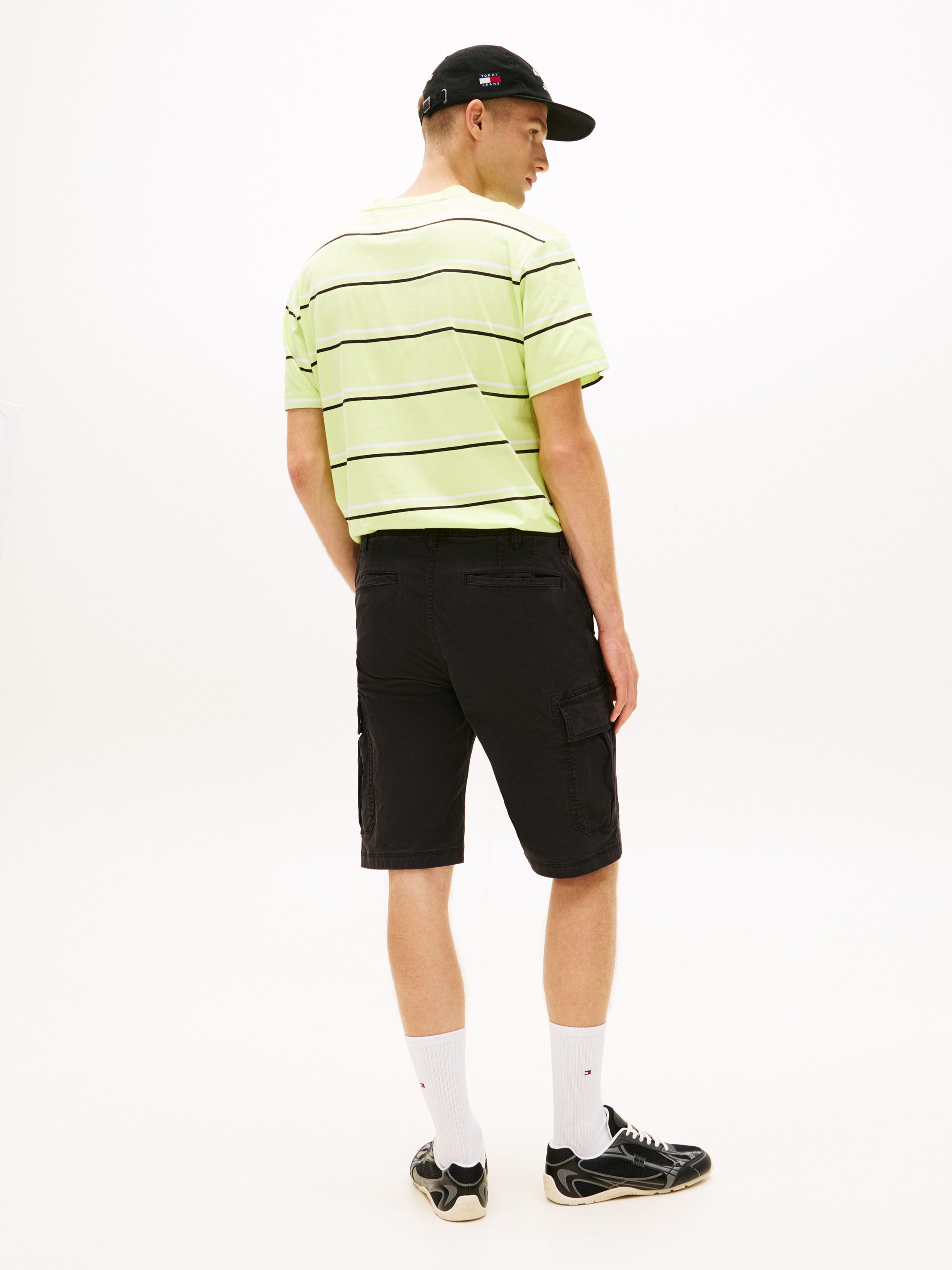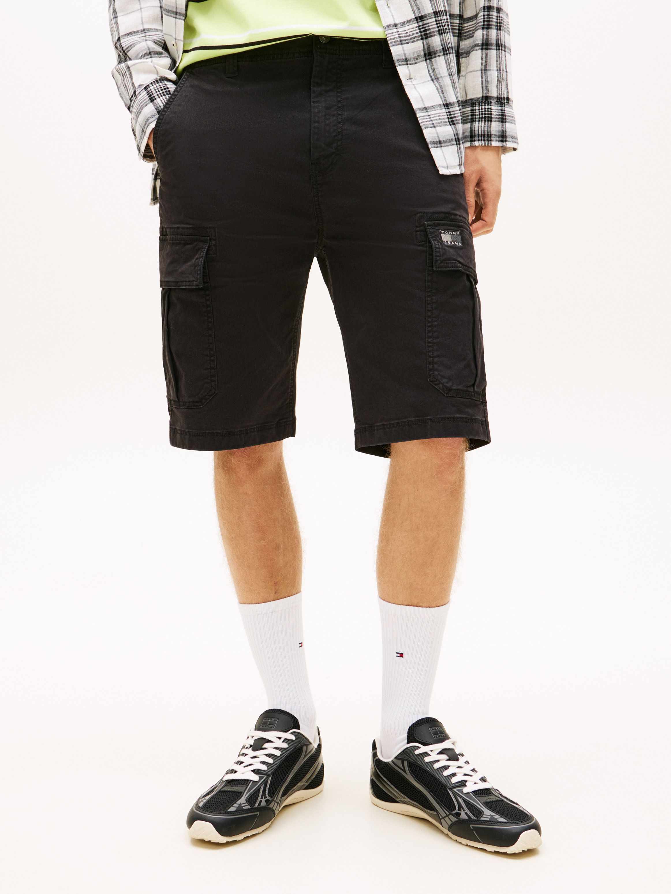 تمنح اللمسة المغسولة هذا الشورت الكارجو المصنوع من القطن المطاطي مظهراً مستعملاً، بينما تضفي الجيوب المتعددة طابعاً عملياً. أبرز التفاصيل • قطن مطاطي • لمسة مغسولة • إغلاق بسحاب مع زر • جيبان جانبيان مائلان • جيبان خلفيان بفتحة ويلت • جيبان جانبيان كارجو • زر معدني يحمل العلامة • شارة تومي بلون متناسق على جيب الكارجو • علامة تومي جينز القصة والمقاس • قصة عادية الخامة والعناية • 97% قطن، 3% إيلاستان