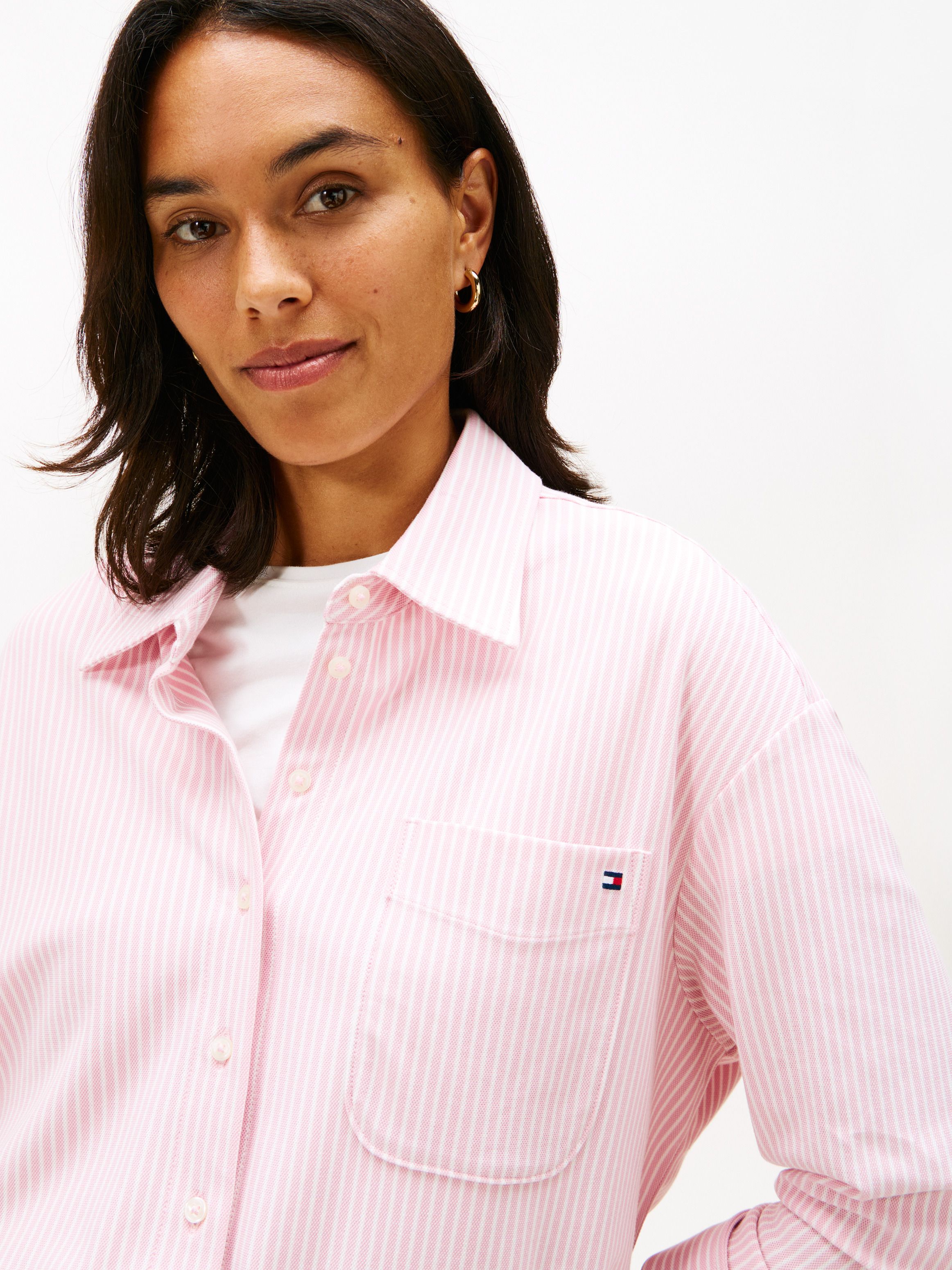 يقدم القميص البيكيه المخطط بقصة مريحة وأكمام طويلة تفسيراً عصرياً لأسلوب الحياة اليومي، مصنوع من قطن متجدد (96%) وإيلاستين (4%) بلمسة وردية أنيقة.
