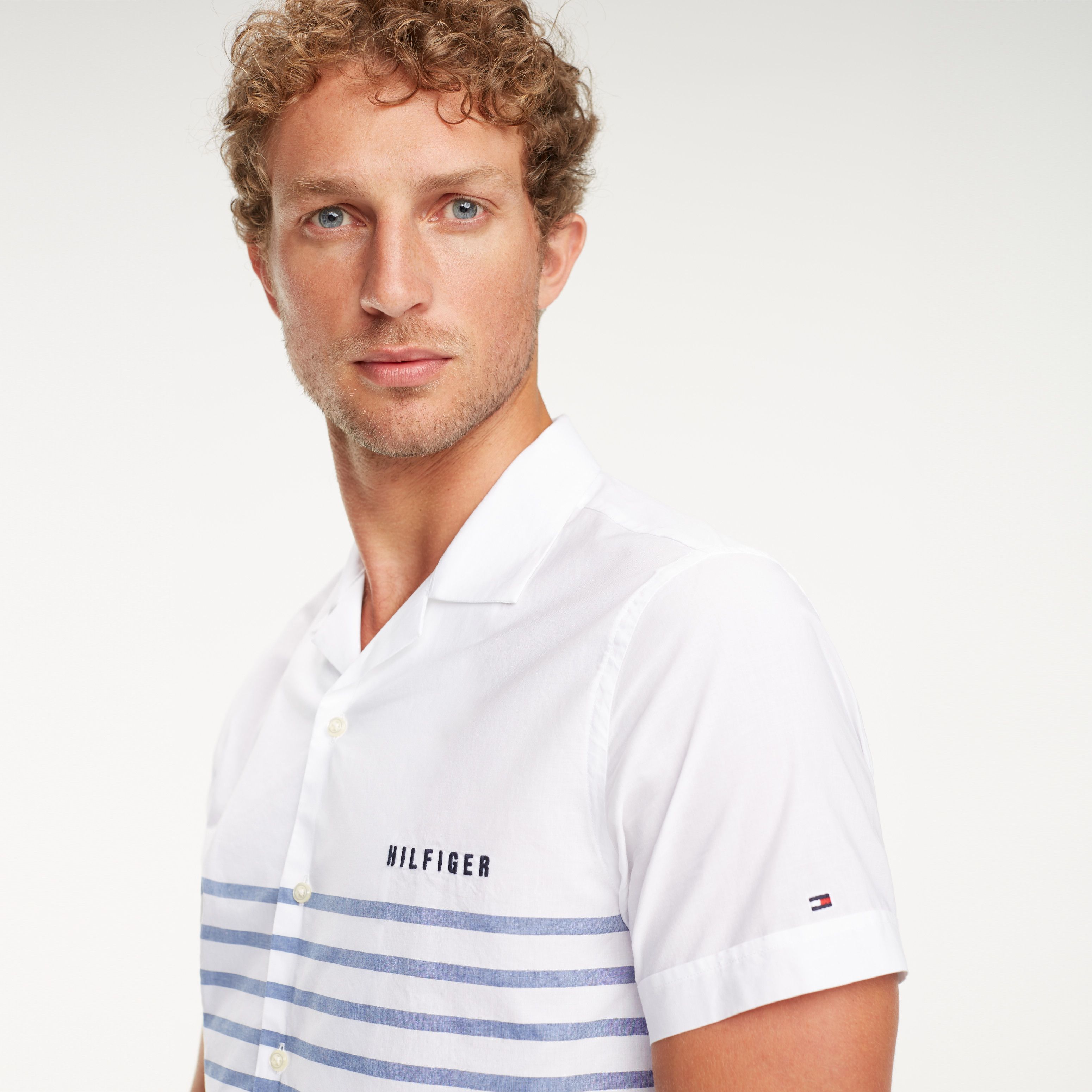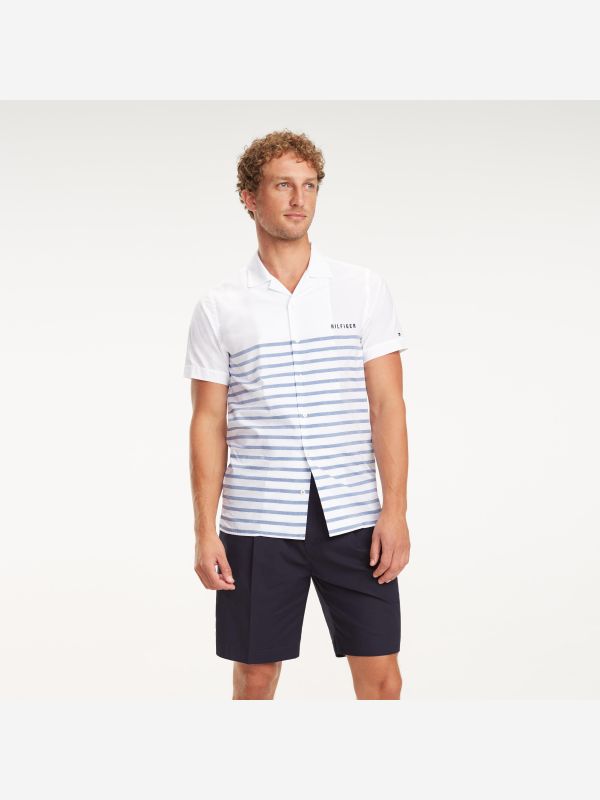 •قطن بوبلين نقي•تصميم مخطط•ياقة مثنية•مزيّن بشعار تومي هيلفيغر على الياقة من الداخل•شعار تومي هيلفيغر مطرّز على الصدر•علم تومي هيلفيغر مطرّز على الكمال قصّة:•قصّة عادية•طول العارض 1.86م ويرتدي مقاس M