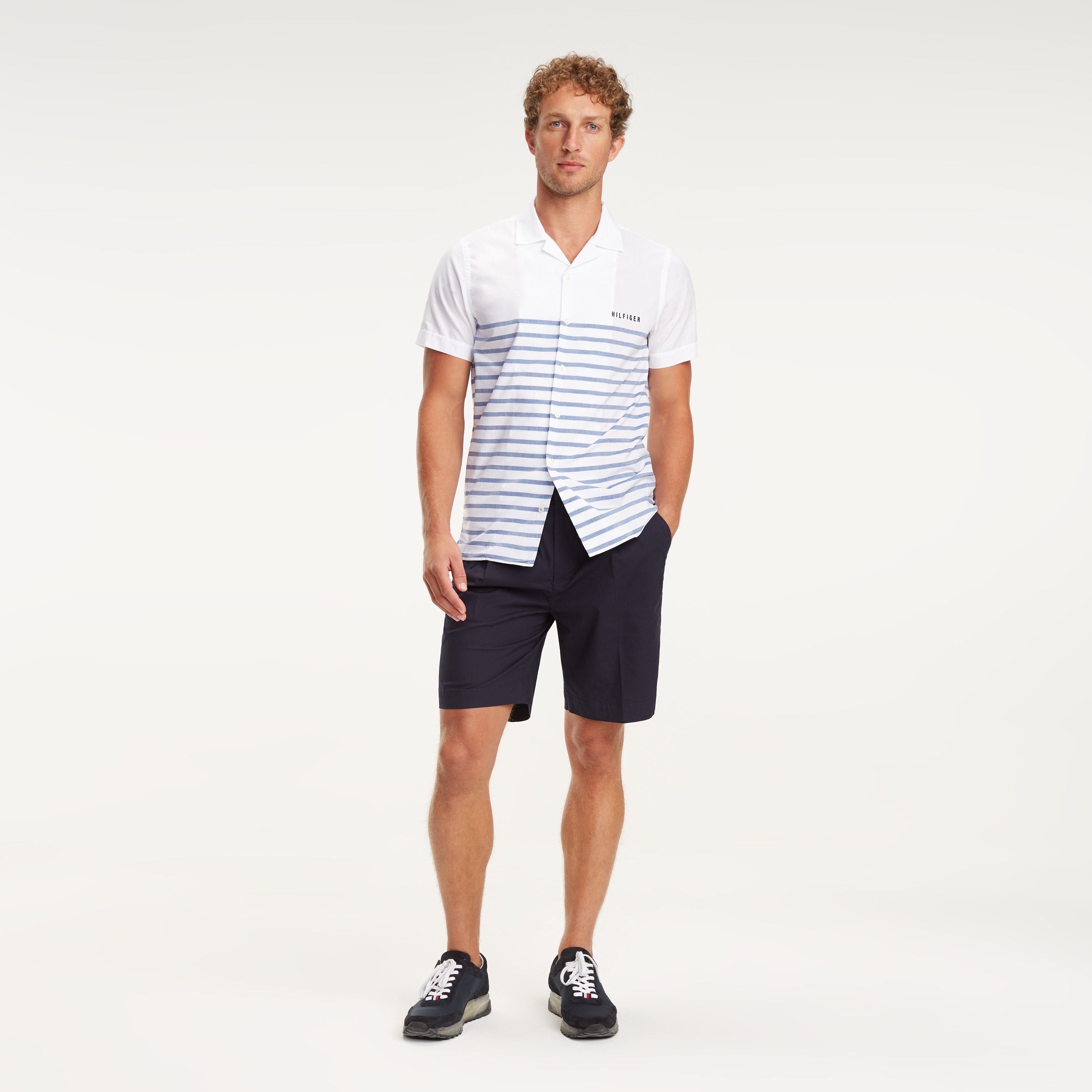 قميص مخطط رائع مصنوع خصيصاً لتتمكن من ارتداؤه في أيام الطقس الدافئ بأكمام قصيرة، مصنوع من القطن النقي