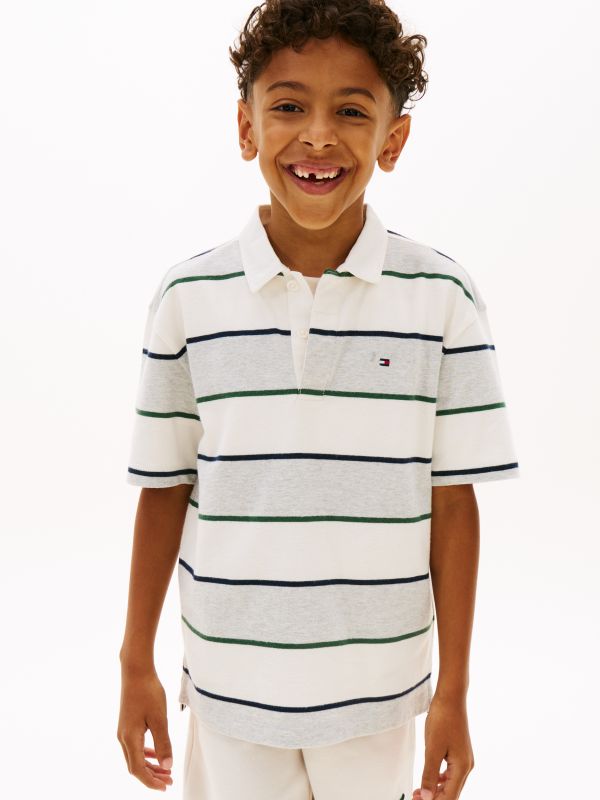 يمزج قميص البولو الرجبي الجيرسي هذا بين الطابع الرياضي بفضل الخطوط الرجبي اللافتة التي تغطي التصميم بالكامل وفتحة الأزرار المخفية المرتبة.