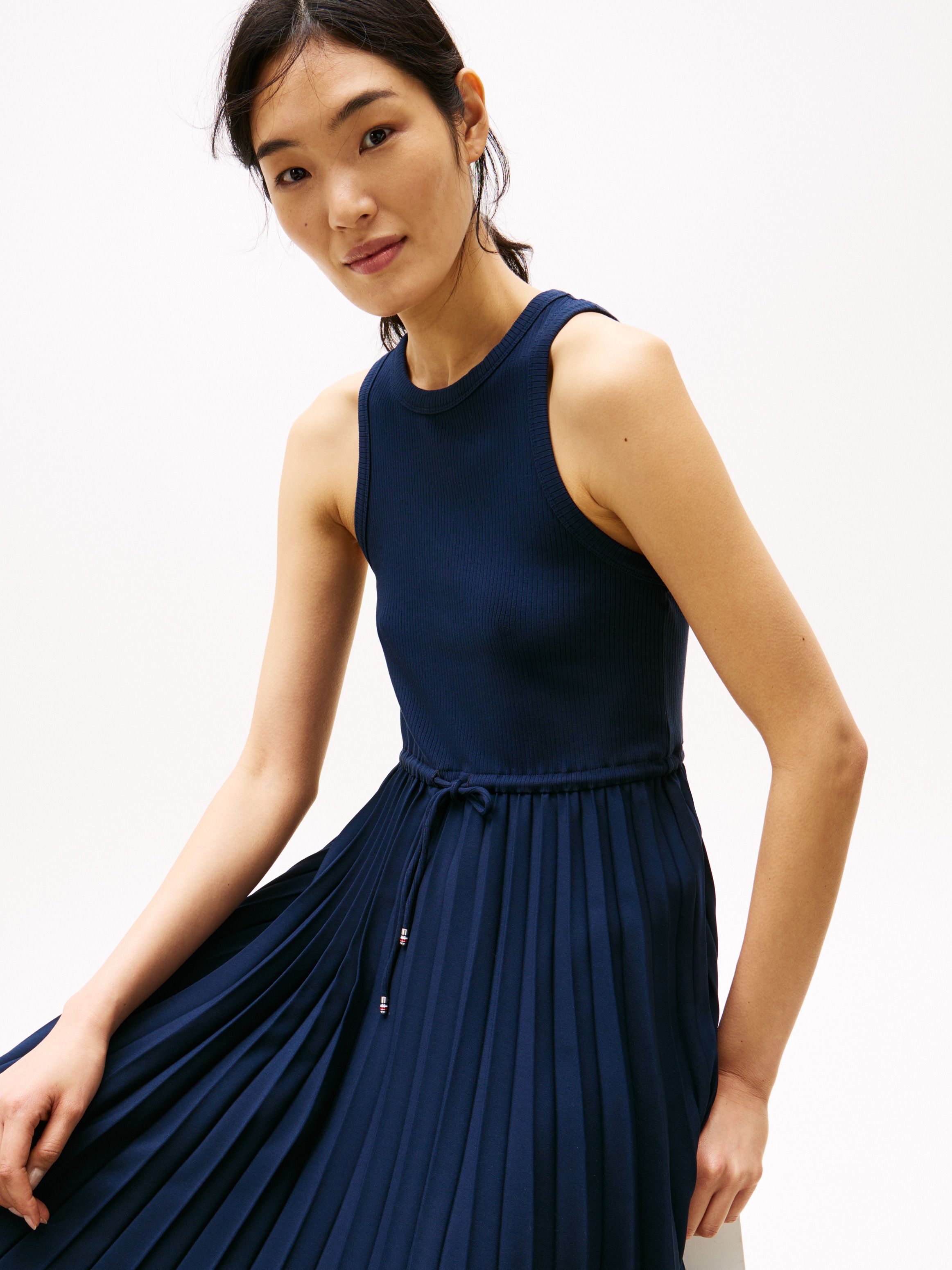 فستان ميدي بدون أكمام مستوحى من البلوزات المقصوصة يوازن بين الأناقة الرياضية واللمسة الأنثوية، بفضل تصميمه الذي يجمع بين صدر مضلع وتنورة بطيات.