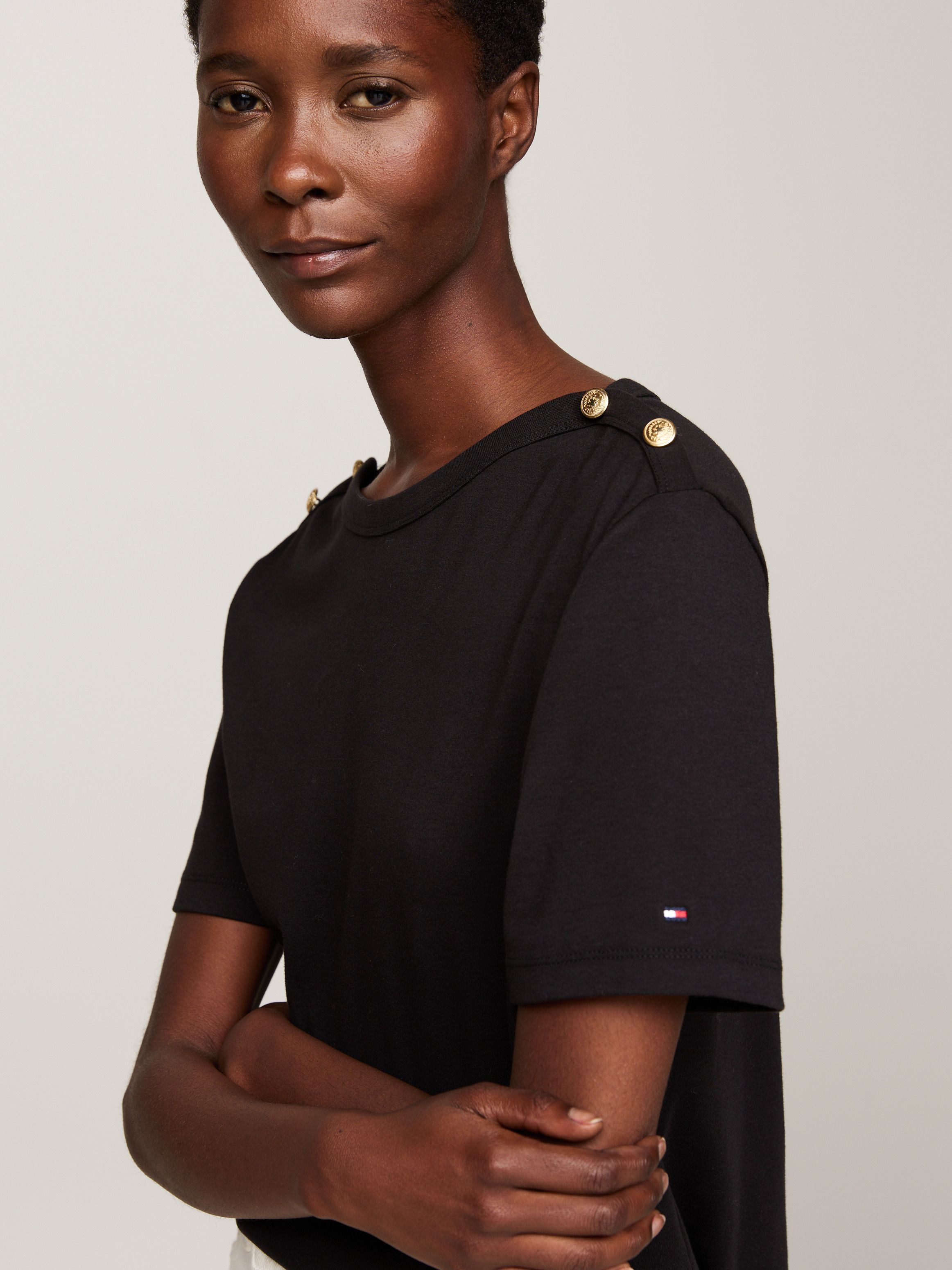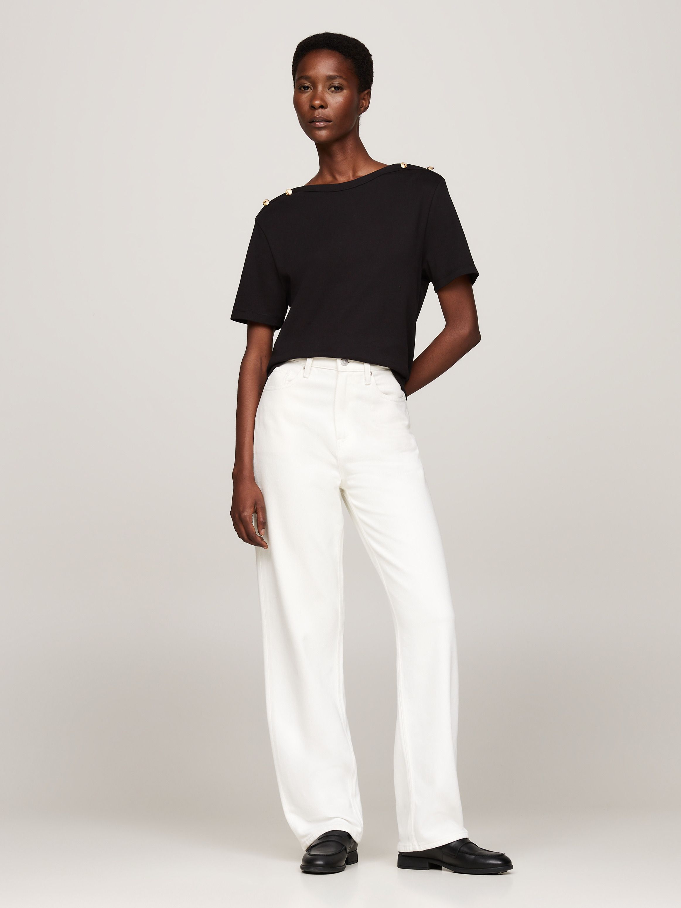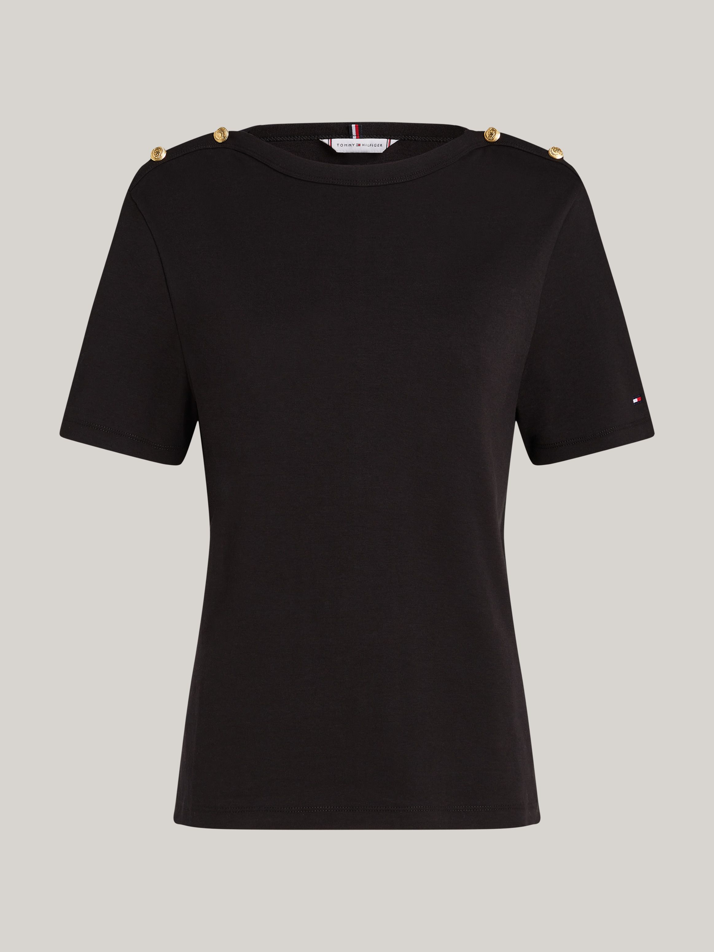 تألقي بإطلالة مستوحاة من الأجواء البحرية مع هذا التيشيرت المخطط الذي يتميز بياقة مفتوحة وأزرار ذهبية اللون على الأكتاف.