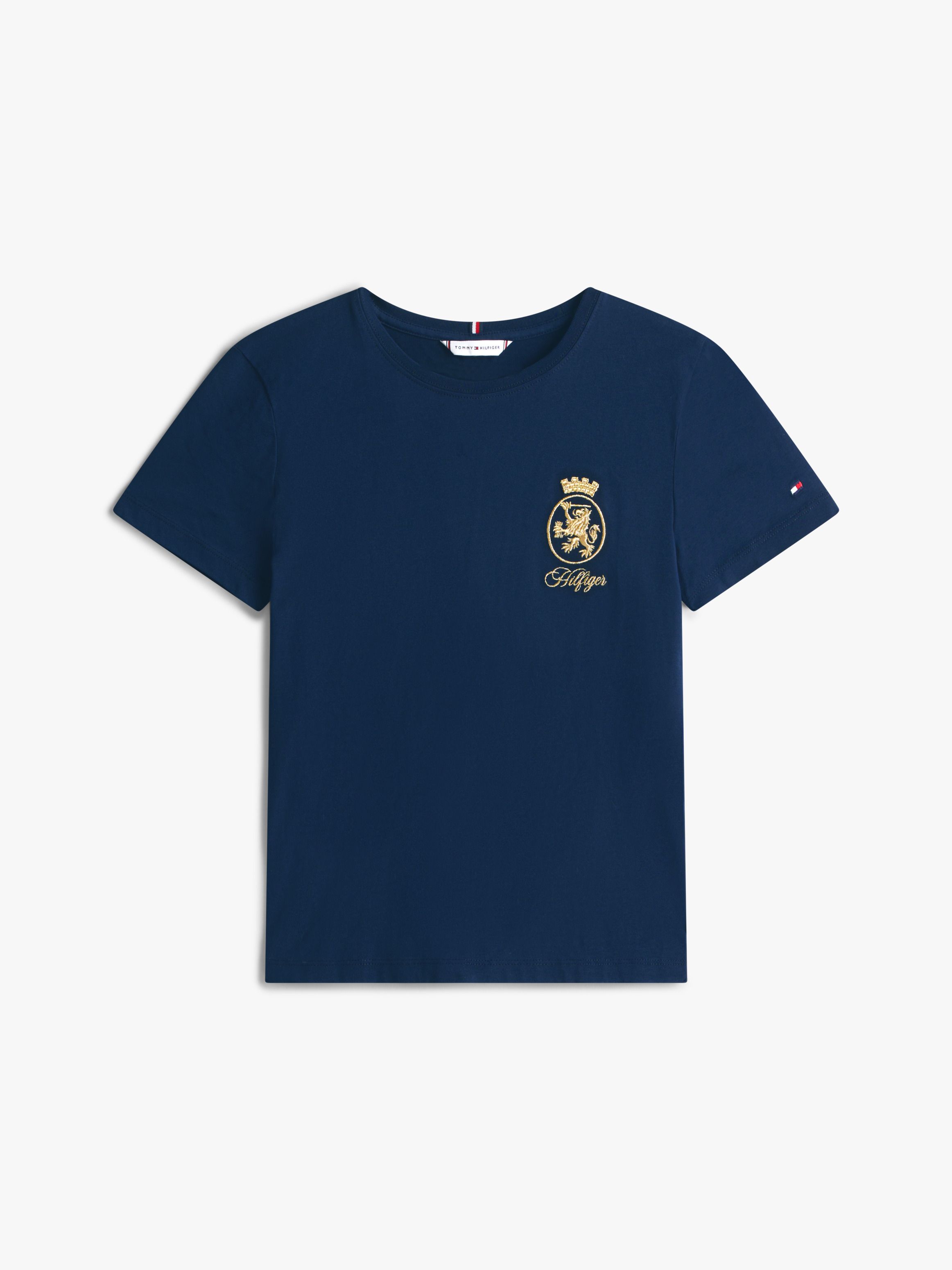 احصلي على لمسة راقية لأي إطلالة يومية مع هذا التيشيرت المصنوع من جيرسي قطني نقي، والمزدان بتطريز شعار crest ذهبي فاخر على الصدر يعكس التفرد والرقي.
