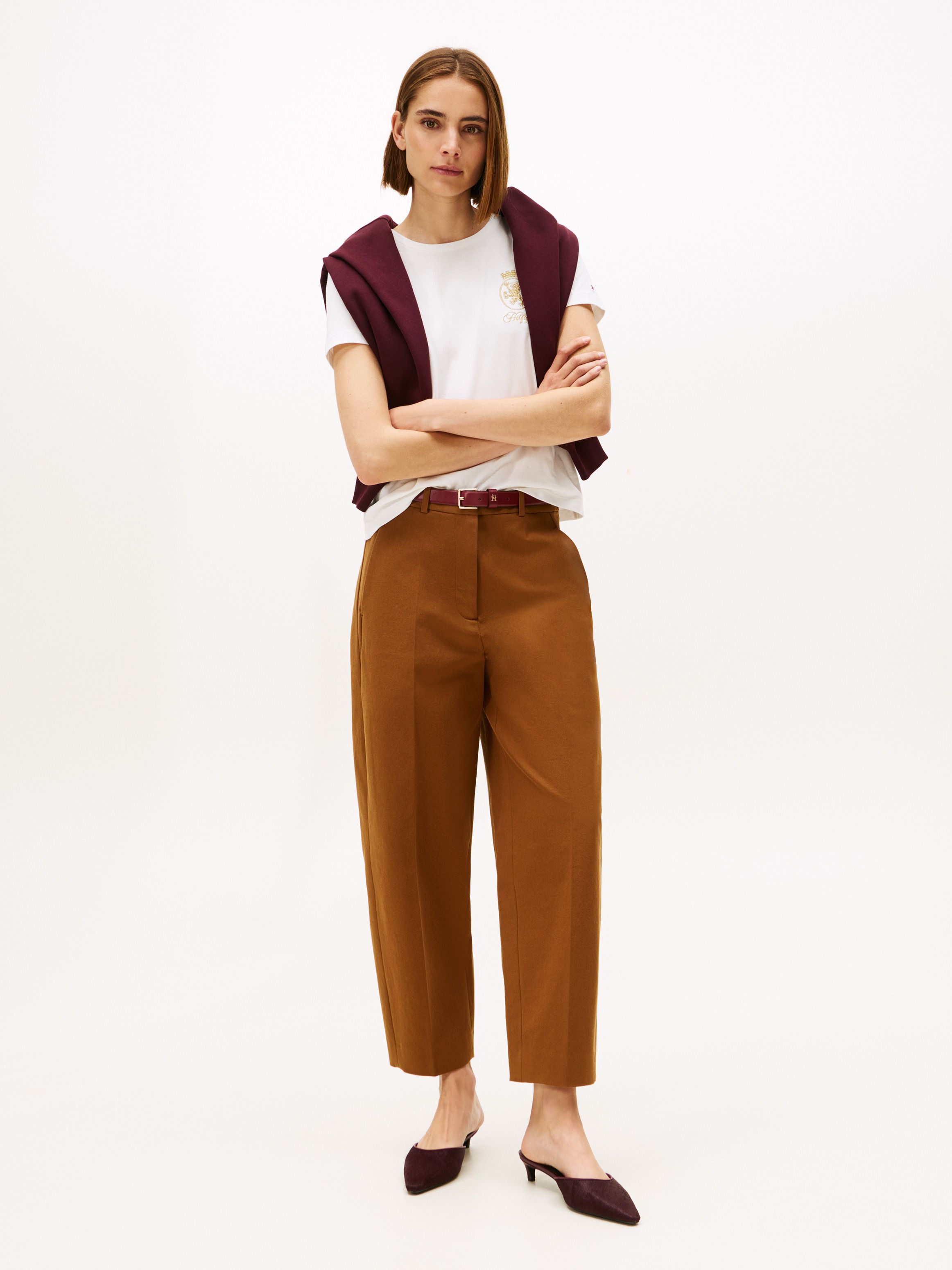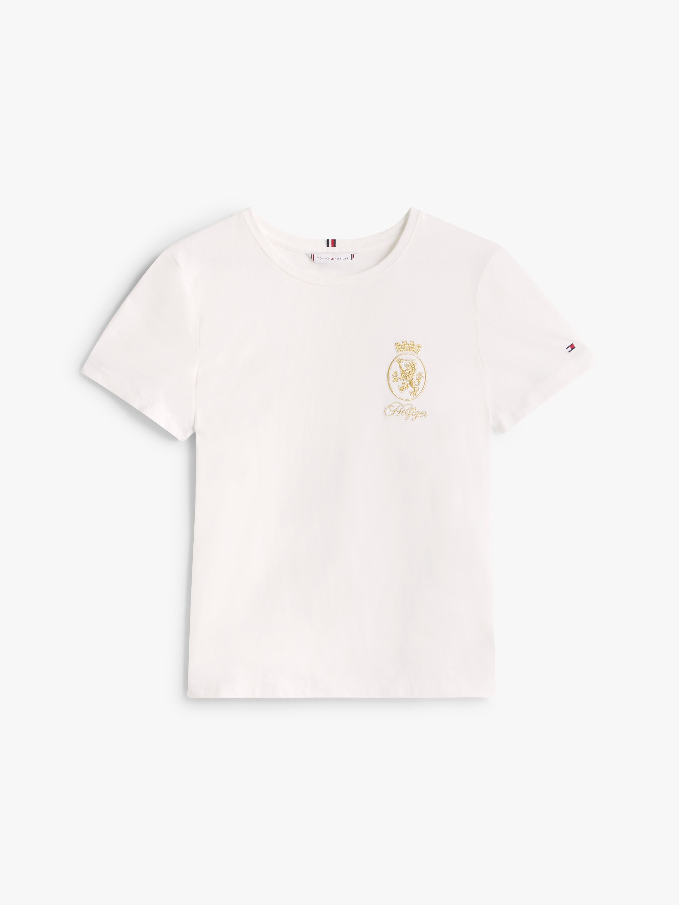 احصلي على لمسة راقية لأي إطلالة يومية مع هذا التيشيرت المصنوع من جيرسي قطني نقي، والمزدان بتطريز شعار crest ذهبي فاخر على الصدر يعكس التفرد والرقي.