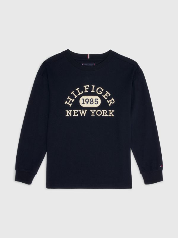 يعتبر هذا التيشيرت بأكمام طويلة والمزين بشعار مستوحى من التصاميم الجامعية من الأمام هو اختيار مثالي للارتداء في الأيام المشمسة.