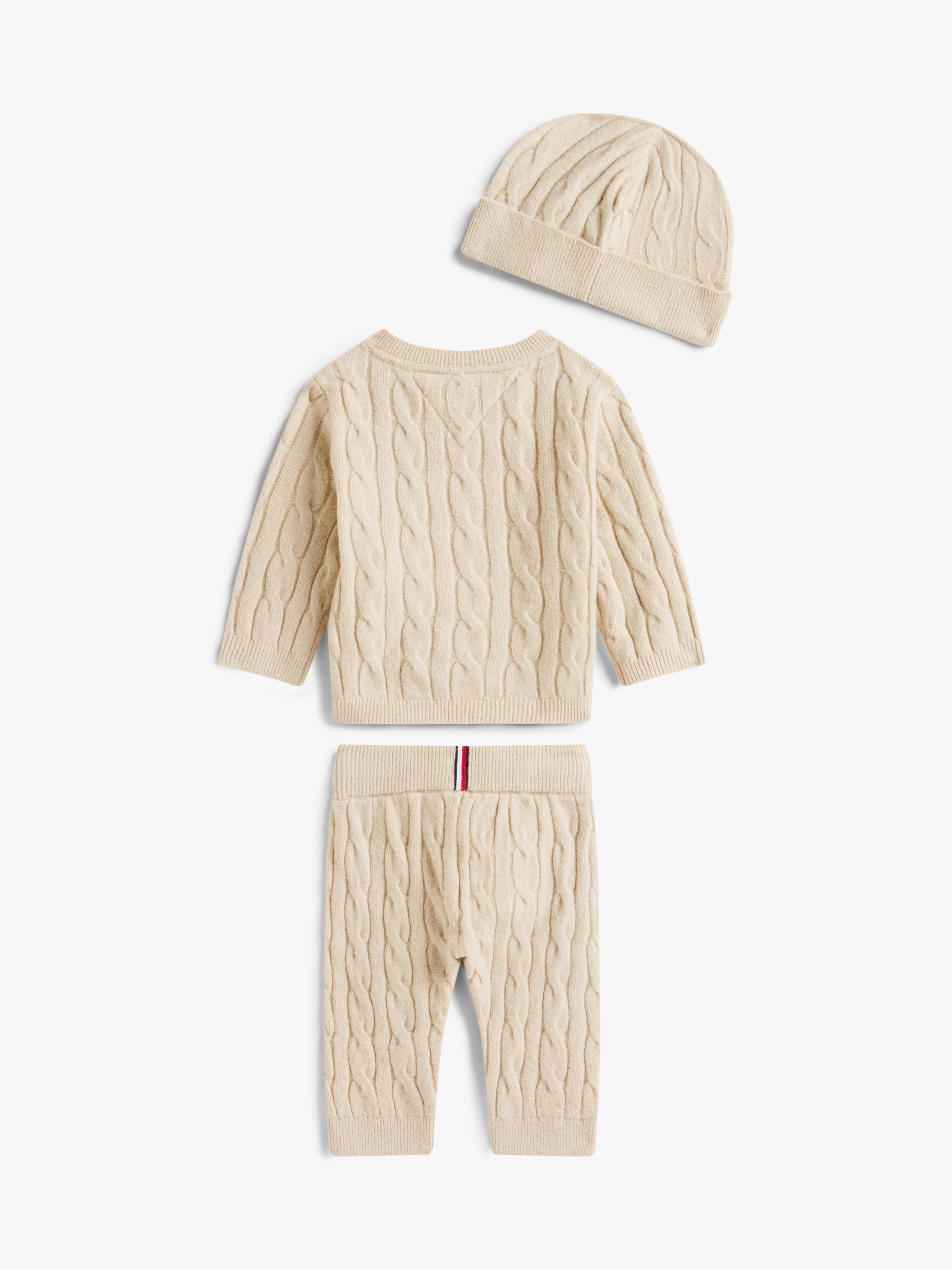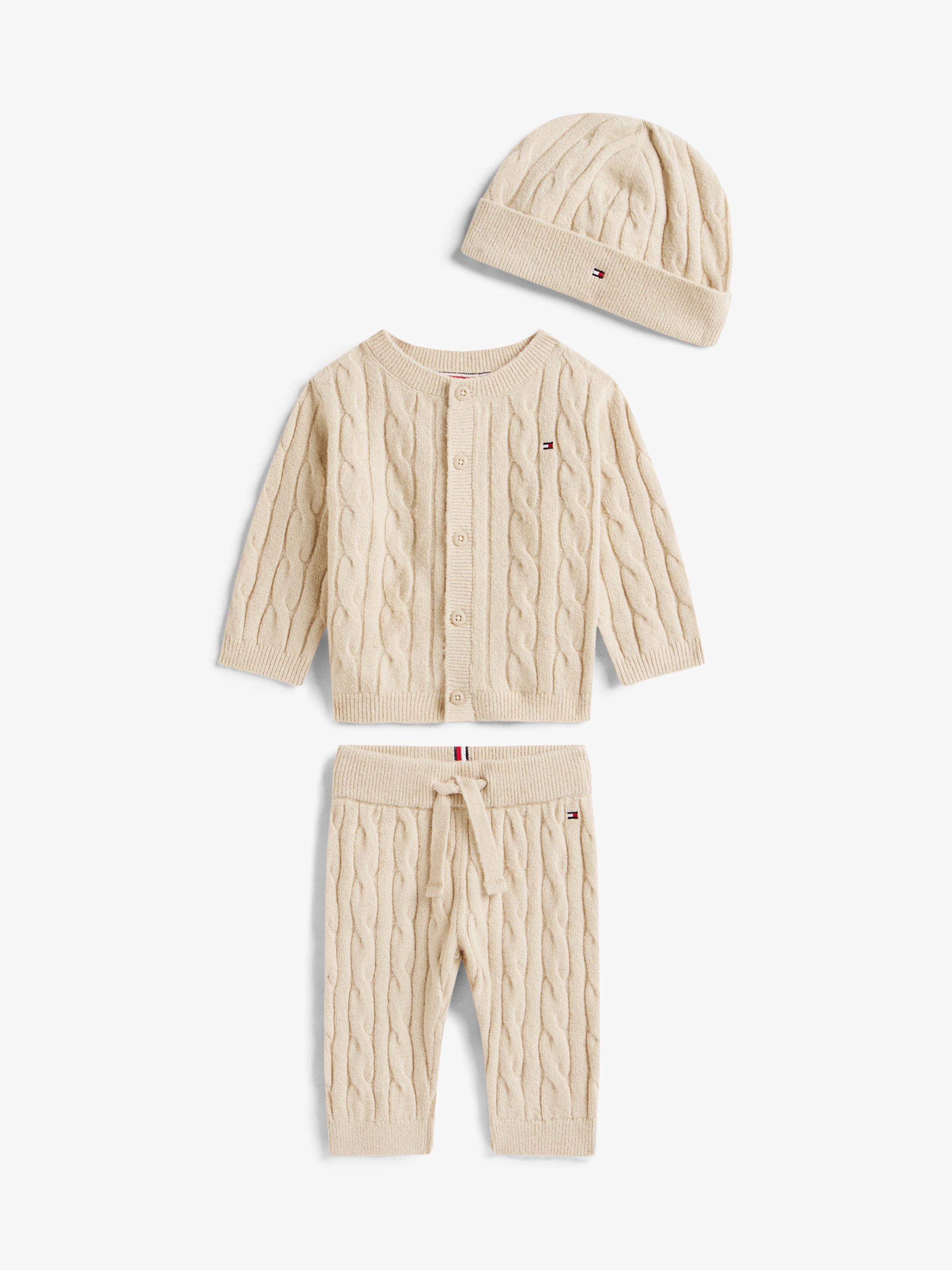 يضم هذا الطقم سترة محبوكة بنقشة الكابليه، وبنطلون جوجر مطابق، وقبّعة دافئة – كلّها داخل علبة هدايا أنيقة تجعل الصغار في غاية الراحة والجاذبية.