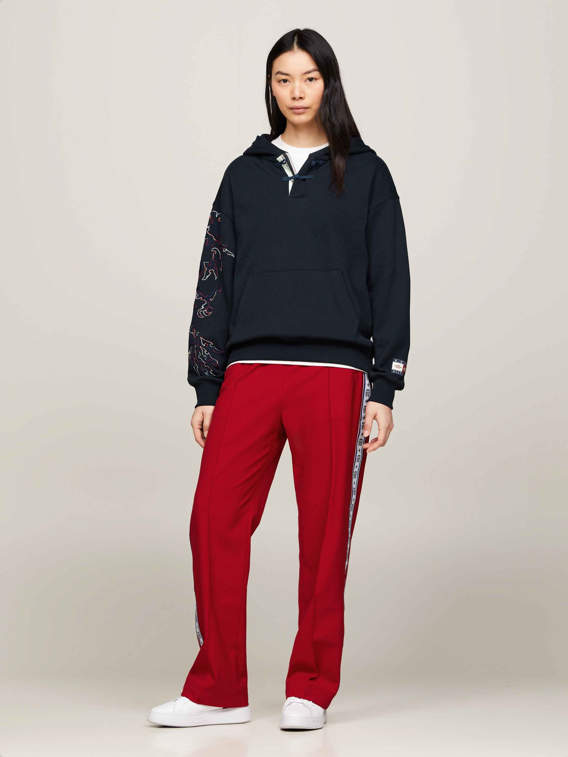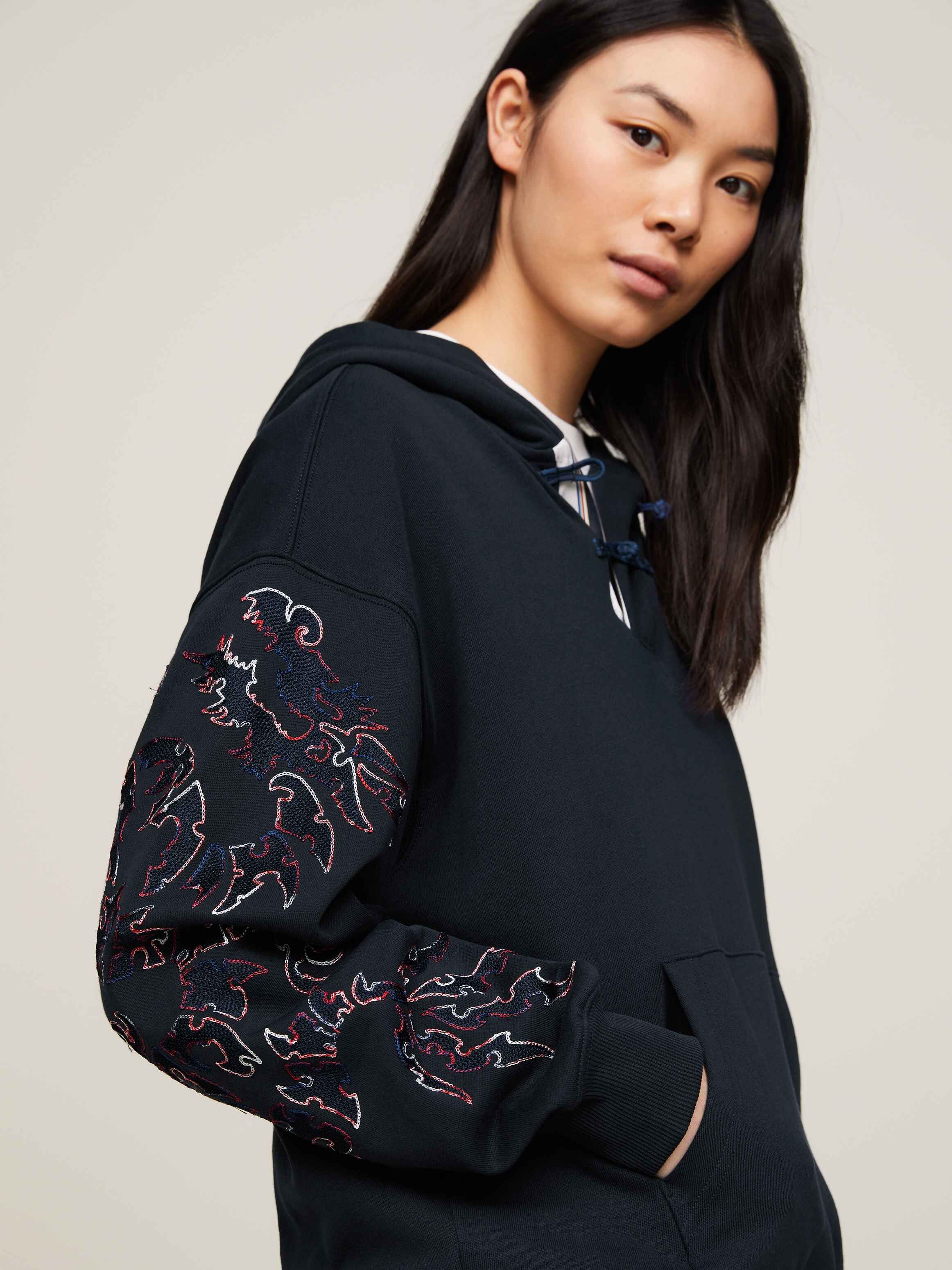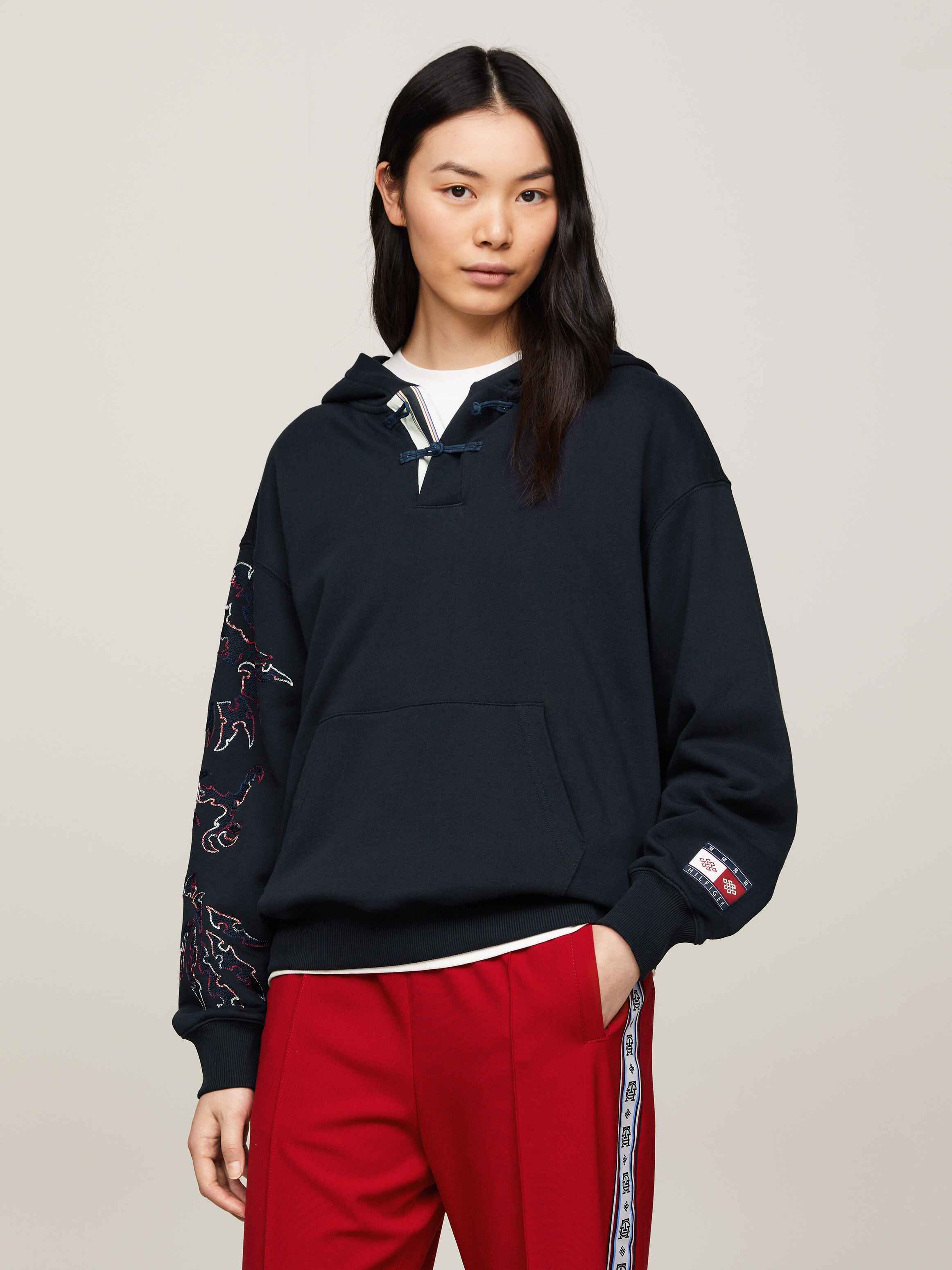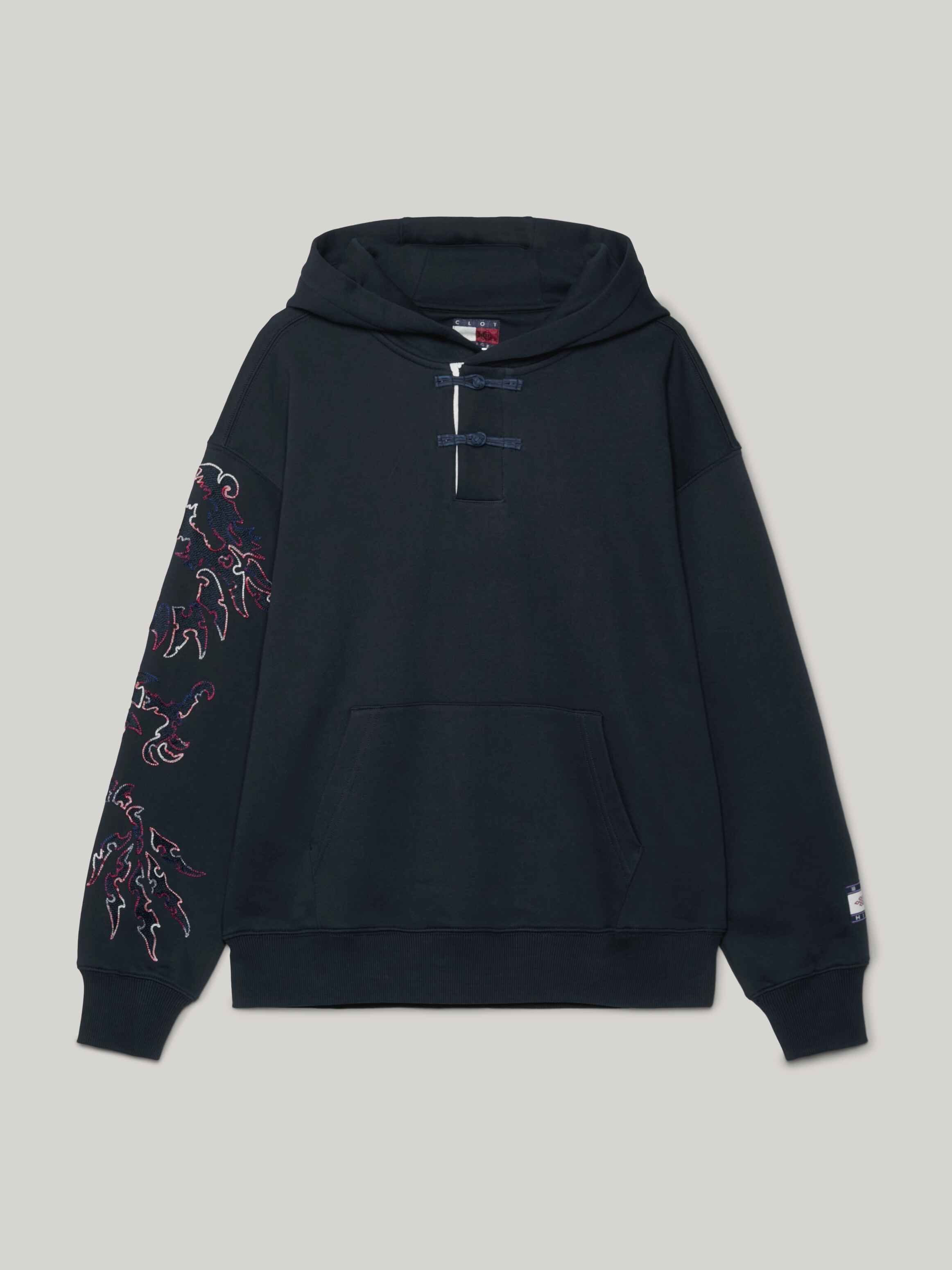 • قطن تيري عضوي نقي • شعار تومي كلوت دراجون على الكم • ياقة بغطاء رأس • نصف فتحة • أساور وحافة مفصلة • جيب واسع • شعار علم تومي كلوت على الكم • علامة تومي كلوت التجارية